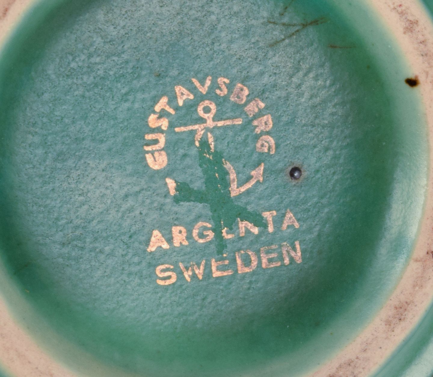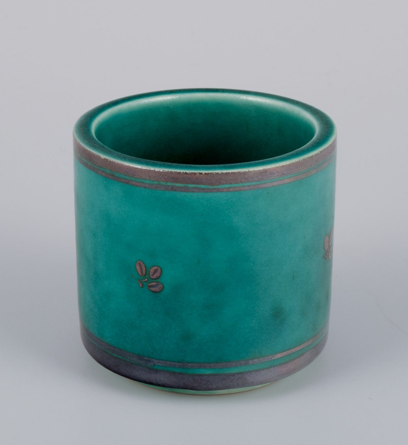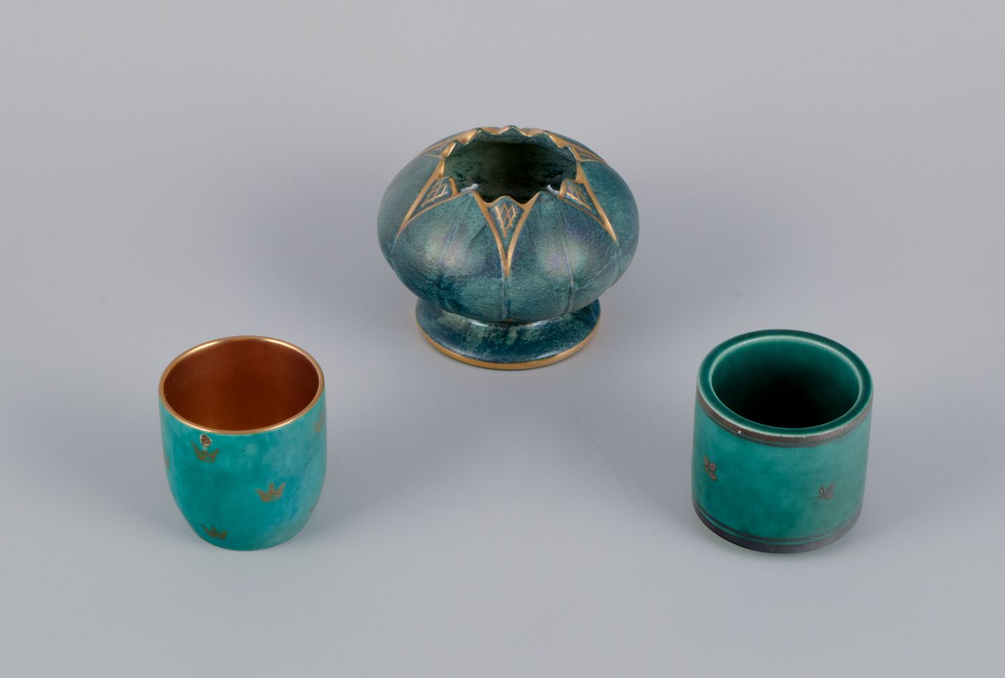 Josef Ekberg og Wilhelm Kåge for Gustavsberg, Sverige. Tre små vaser i forskellige størrelser. Grøn glasur med blomstermotiver indlagt i sølv og guld.