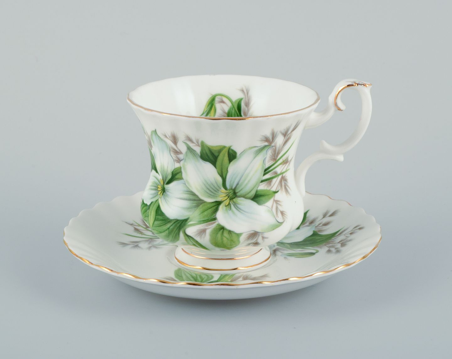 Royal Albert, England. Et sæt på seks ”Trillium” kaffekopper med tilhørende underkopper og kagetallerkner. Dekoreret med blomster og guldkant.