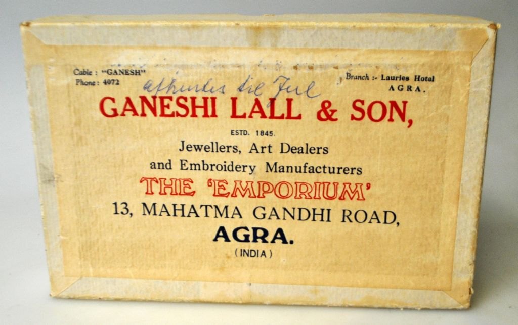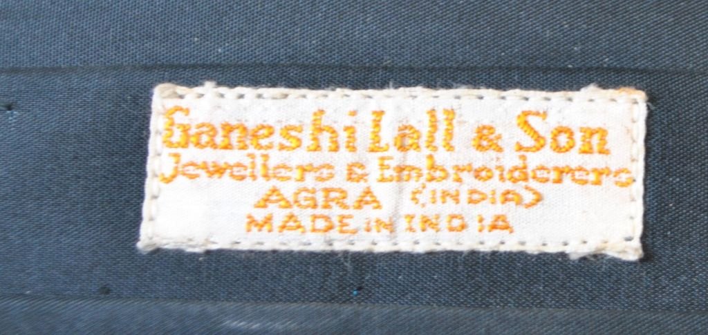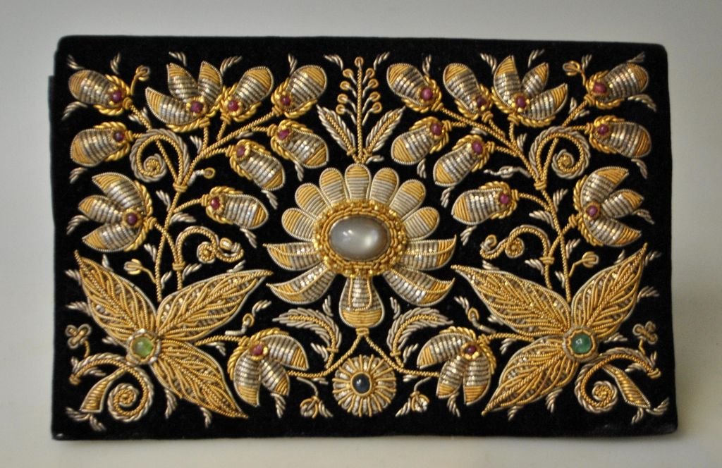 Zardozi Guld broderet fløjls selskabs taske, Ganeshi Lall & Son, Agra, Indien, 20. årh. Taske med sølv og guldtråds broderinger og talrige ædelstene, bl.a. 18 rubiner, turmaliner m.v. 13 x 20 cm. Indvendig med firma etiket. I original æske. Virkelig et fantastisk arbejde! Forretningen er stadig eksisterende. Etableret i 1845.