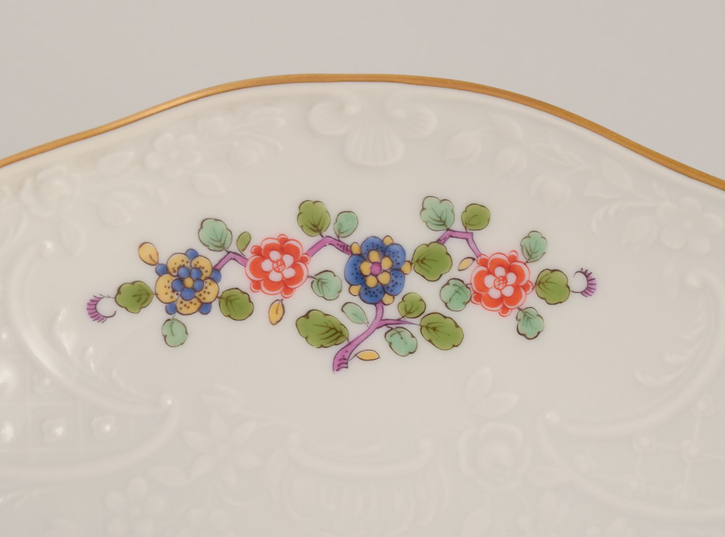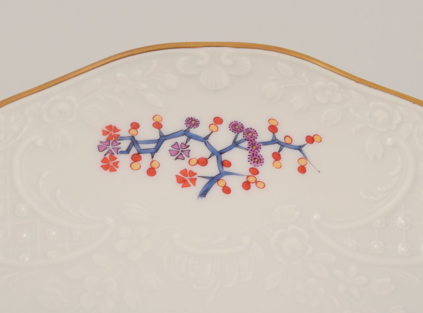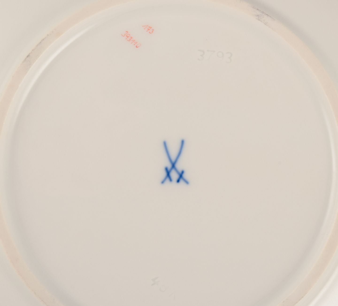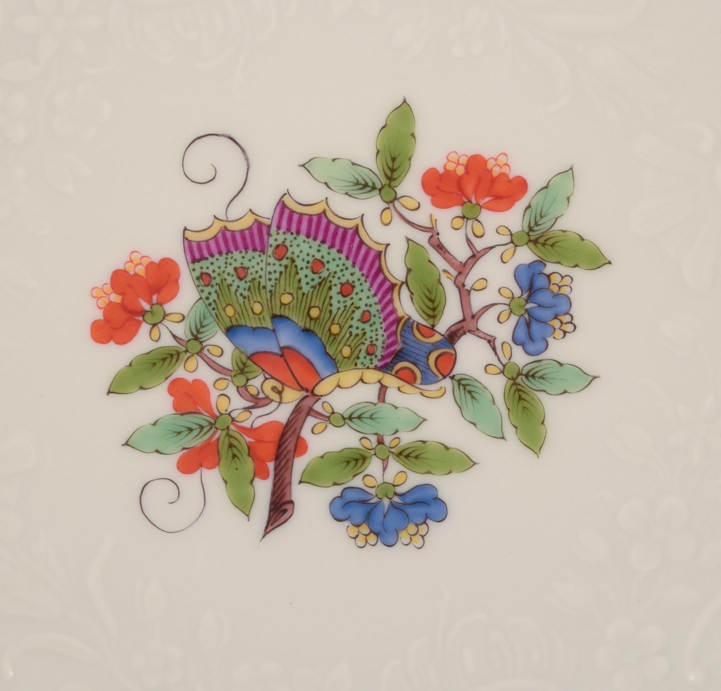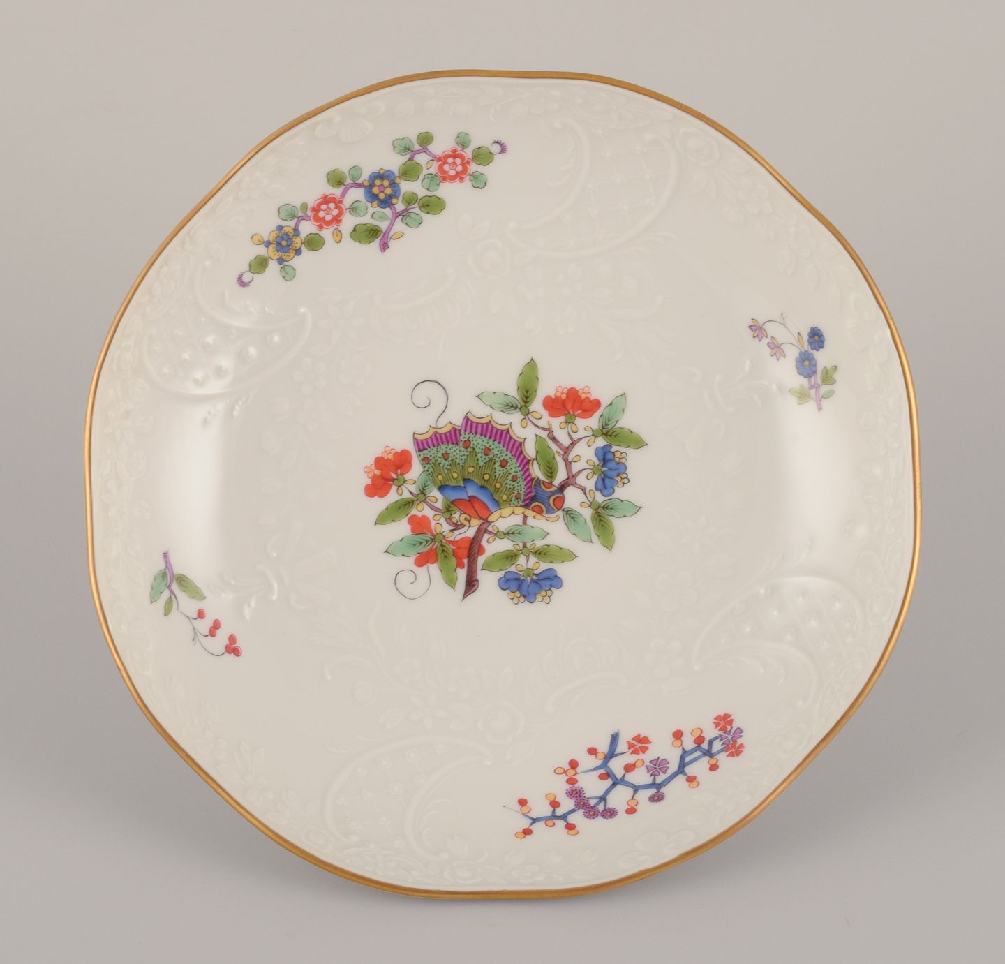 Meissen, Tyskland. Middagstallerken håndmalet med sommerfugl på gren og polykrome blomstermotiver. Guldkant.