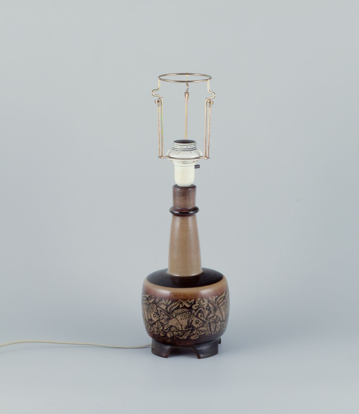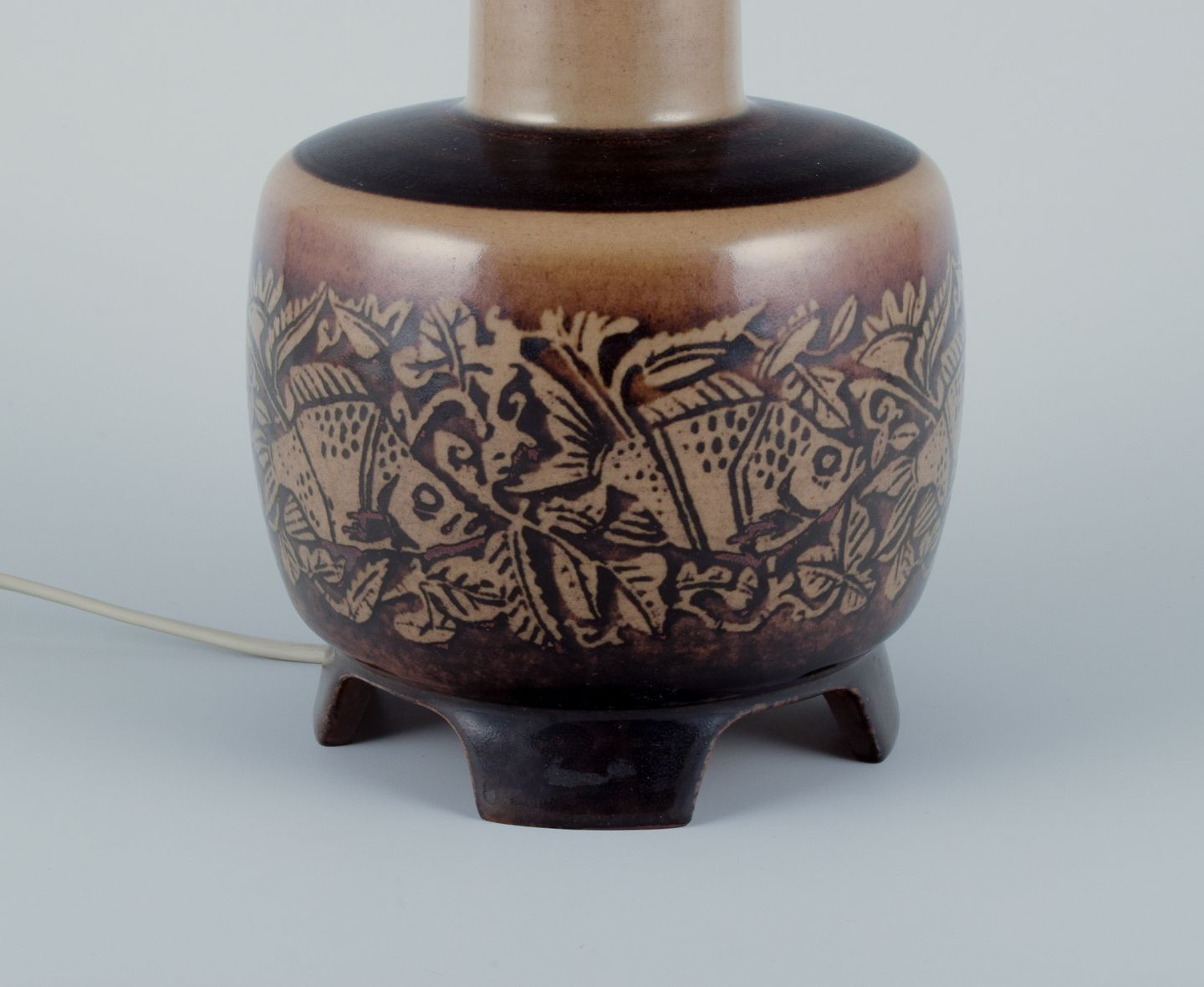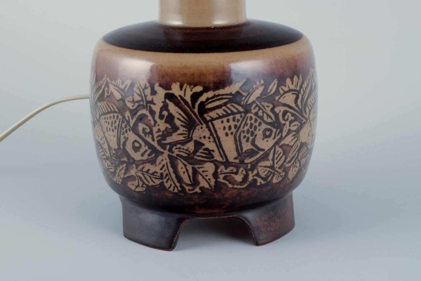 Nils Thorsson for Royal Copenhagen. Bordlampe i stentøj med motiv af svømmende fisk. Glasur i brune toner.