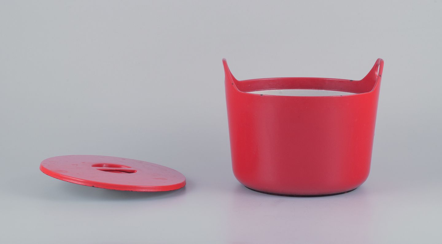 Timo Sarpaneva for Rosenlew, Finland, støbejernsgryde i rød emalje med træskaft.
