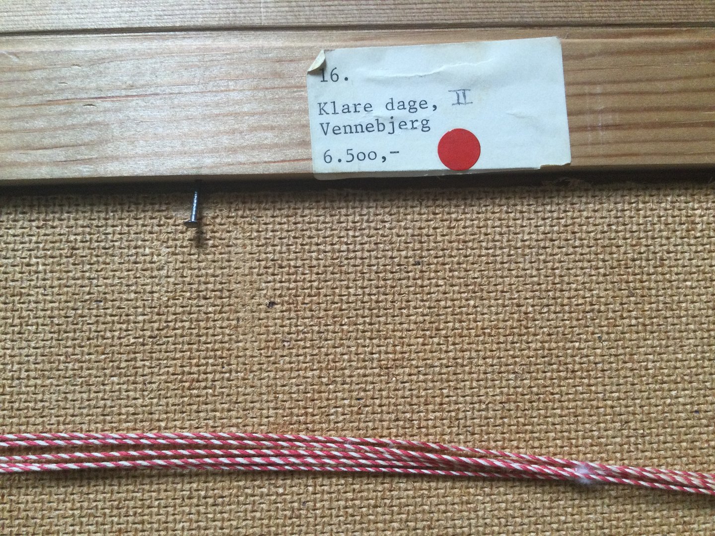 Bagpå label fra udstilling med titlen "Klare dage, Vennebjerg".