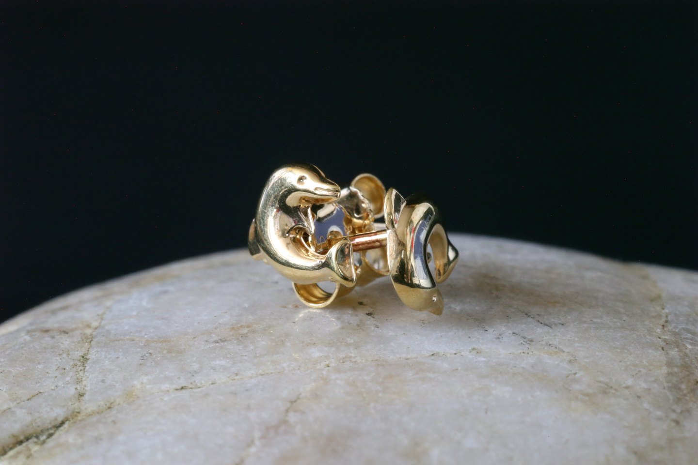 Flotte ørestifter i 14 karat guld, udformet som delfiner. Ørestifterne er flot udformet, så delfinerne fremstår levende. Det giver ørestifterne liv. De vil passe ideelt som gave til et ungt menneske, der vil have et par smukke og sjove ørestifter.