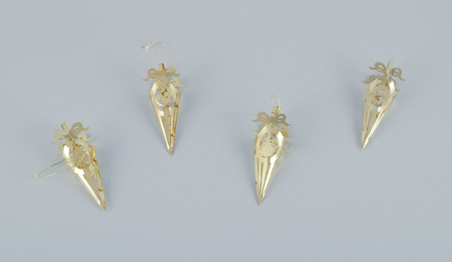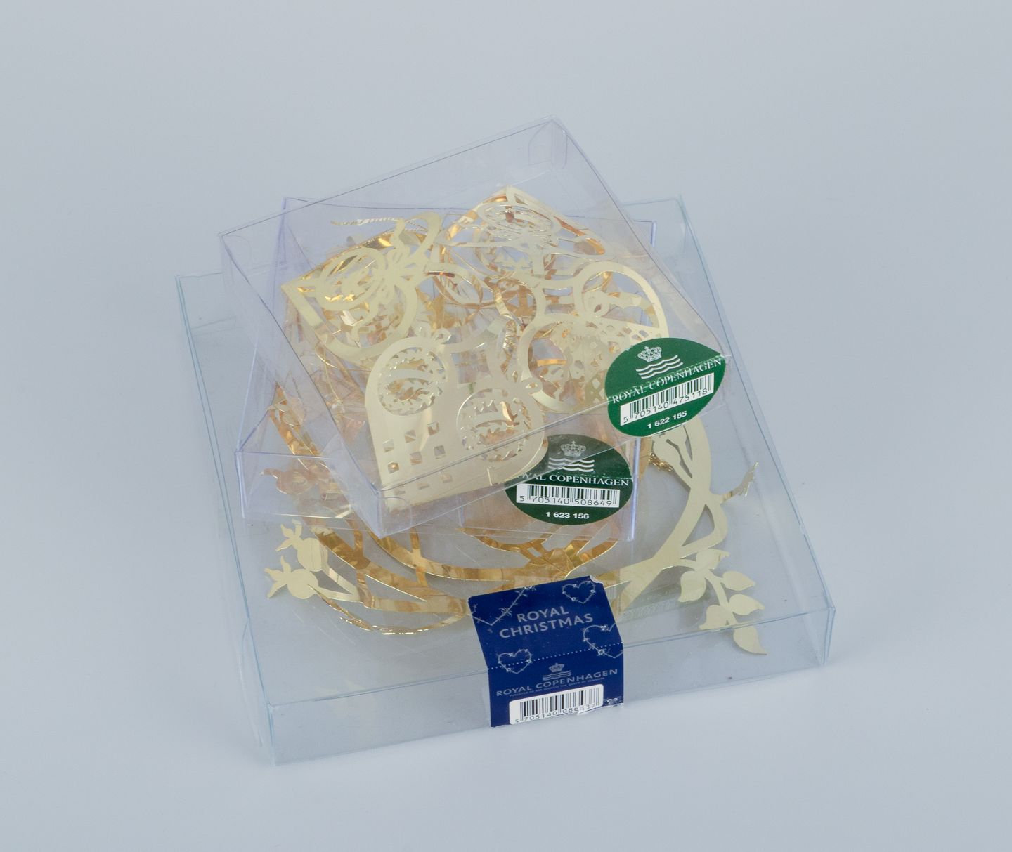 Royal Copenhagen ”Royal Christmas”. Ni juledekorationer i messing til ophæng på juletræ og i vinduet.