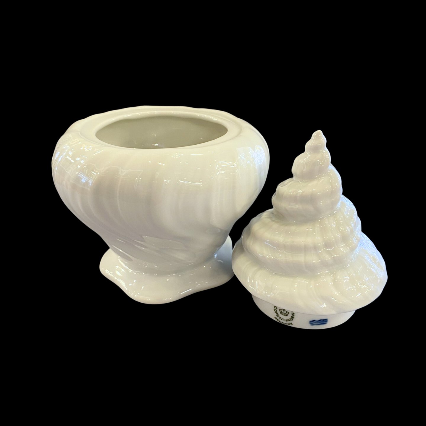 Arje Griegst for Royal Copenhagen; hvidt konkylie stel, sukkerskål med låg #14174. 1. sortering. H. 14 cm. Diam. 10,5 cm.