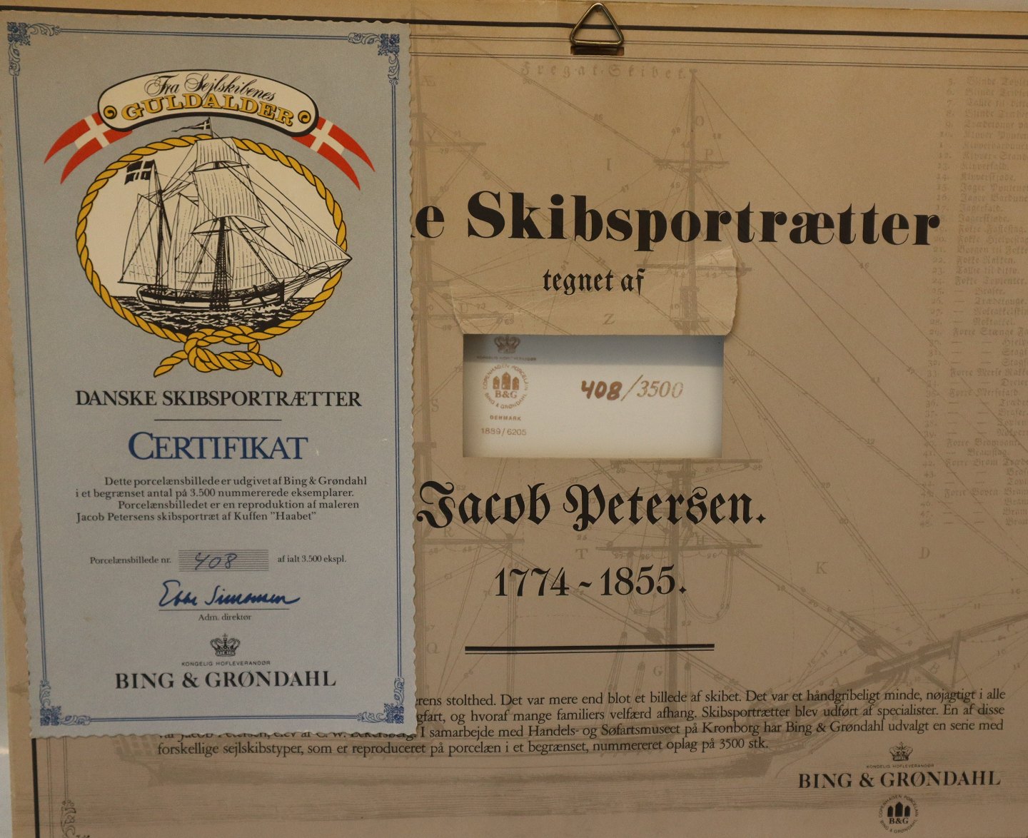 Bing & Grøndahl porcelænsbillede i guldramme B&G Danske Skibsportrætter Jakob Petersen 1774 -1855 no 408 - 3500
