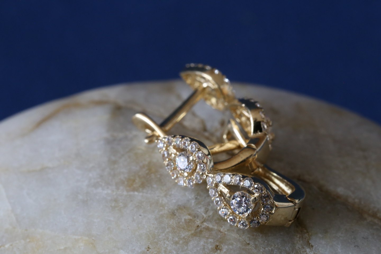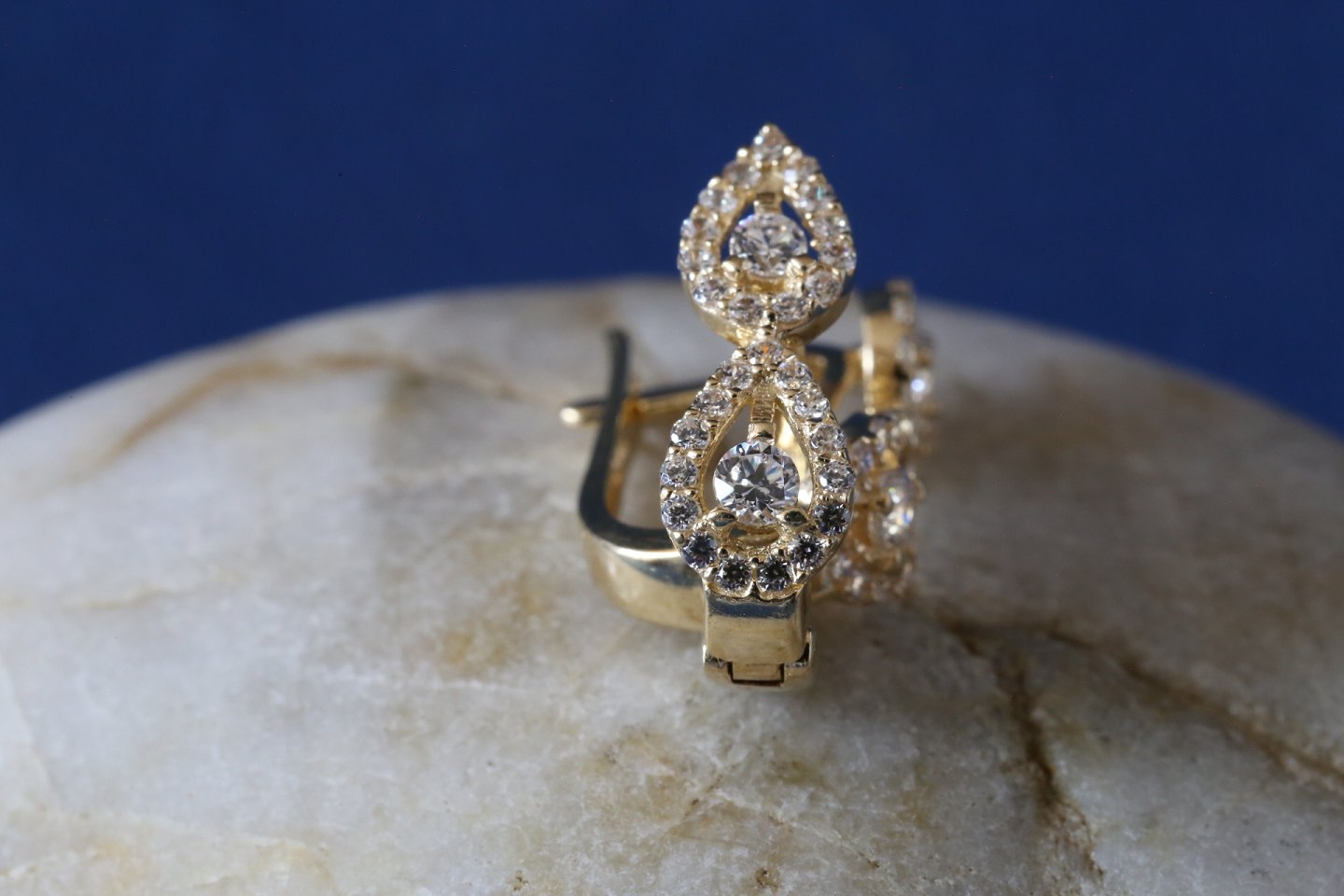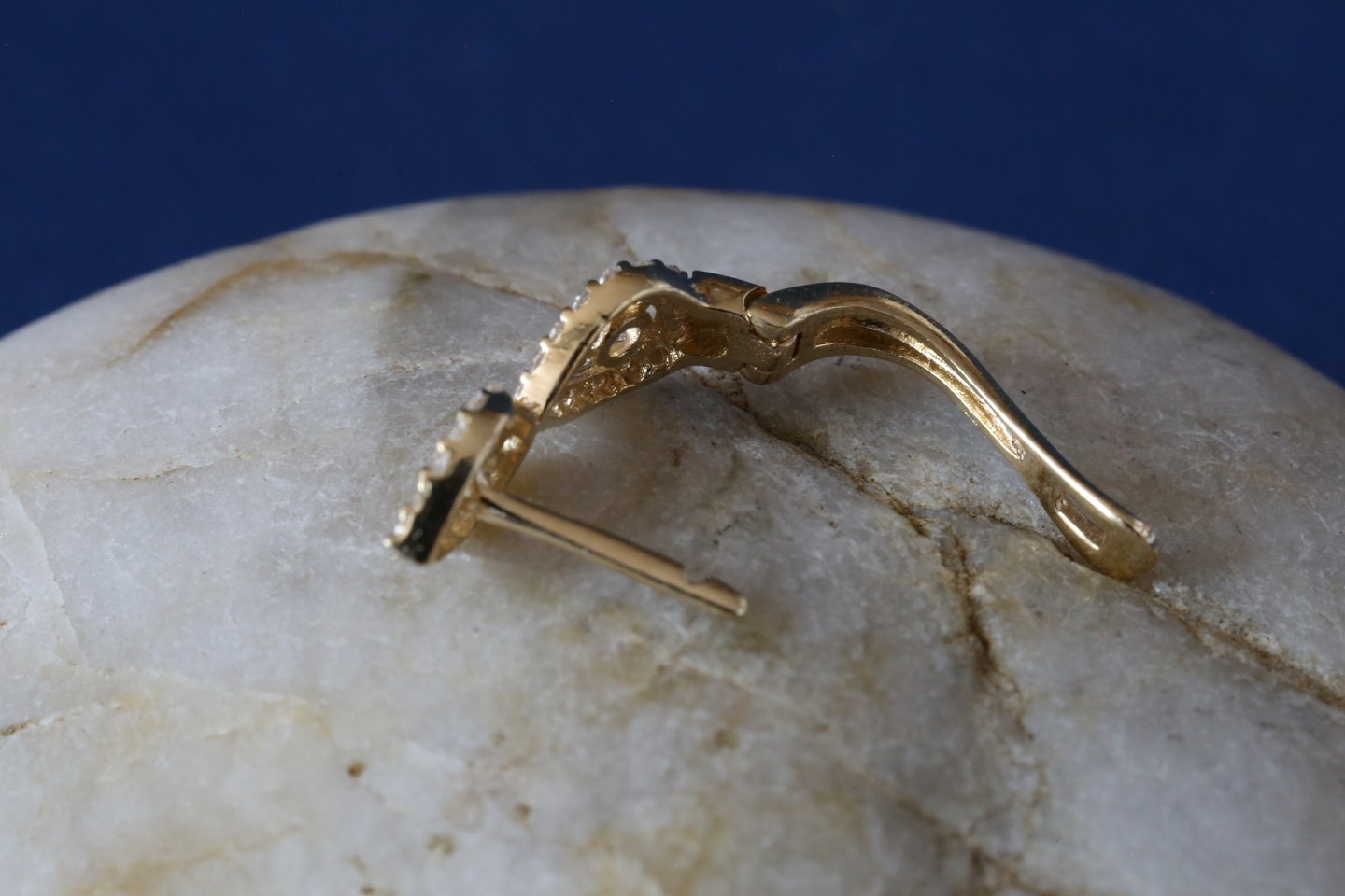 I midten af hver bue, er en enkelt stor flot hvid sten. Øreringene er i 14 karat guld, stemplet 585. Du kan med fordel kombinere disse øreringe, med en flot halskæde.