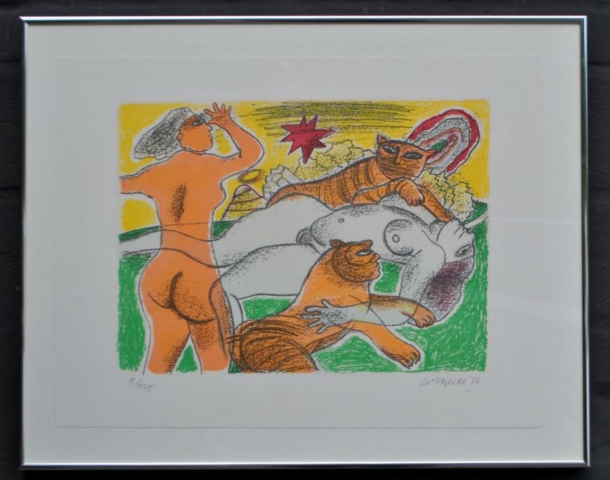 Corneille, C. van Beverloo (1922 - 2010) Belgien: Komposition. Farvelitografi. Signeret 9/125. 38 x 50 cm.  Indrammet: 47 x 60 cm.  NB: Der ydes ingen rabat på dette lot!