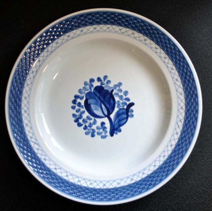 Royal Copenhagen, Aluminia, lille dyb tallerken, 947, 20. årh. København, Danmark. Stemplet. 1. Sortering. Dia.: 23 cm.