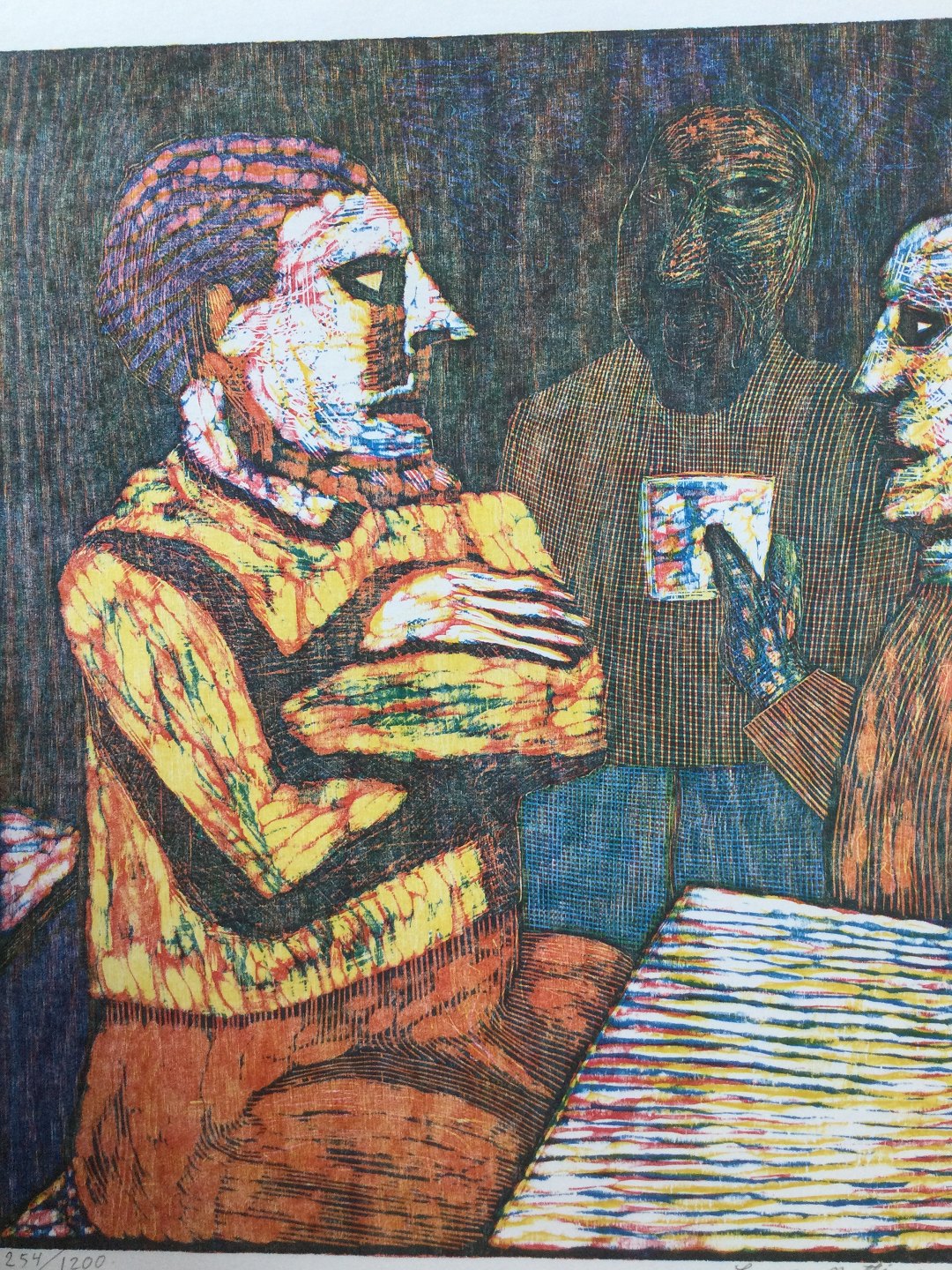 Farvetræsnit - Seppo Mattinen - 3 personer ved bord.