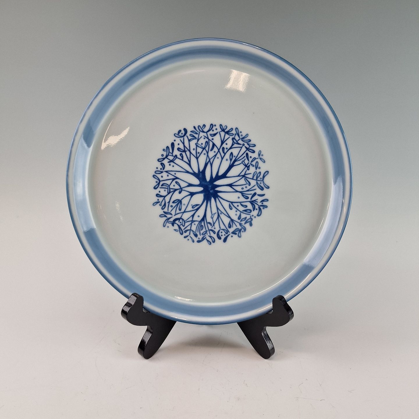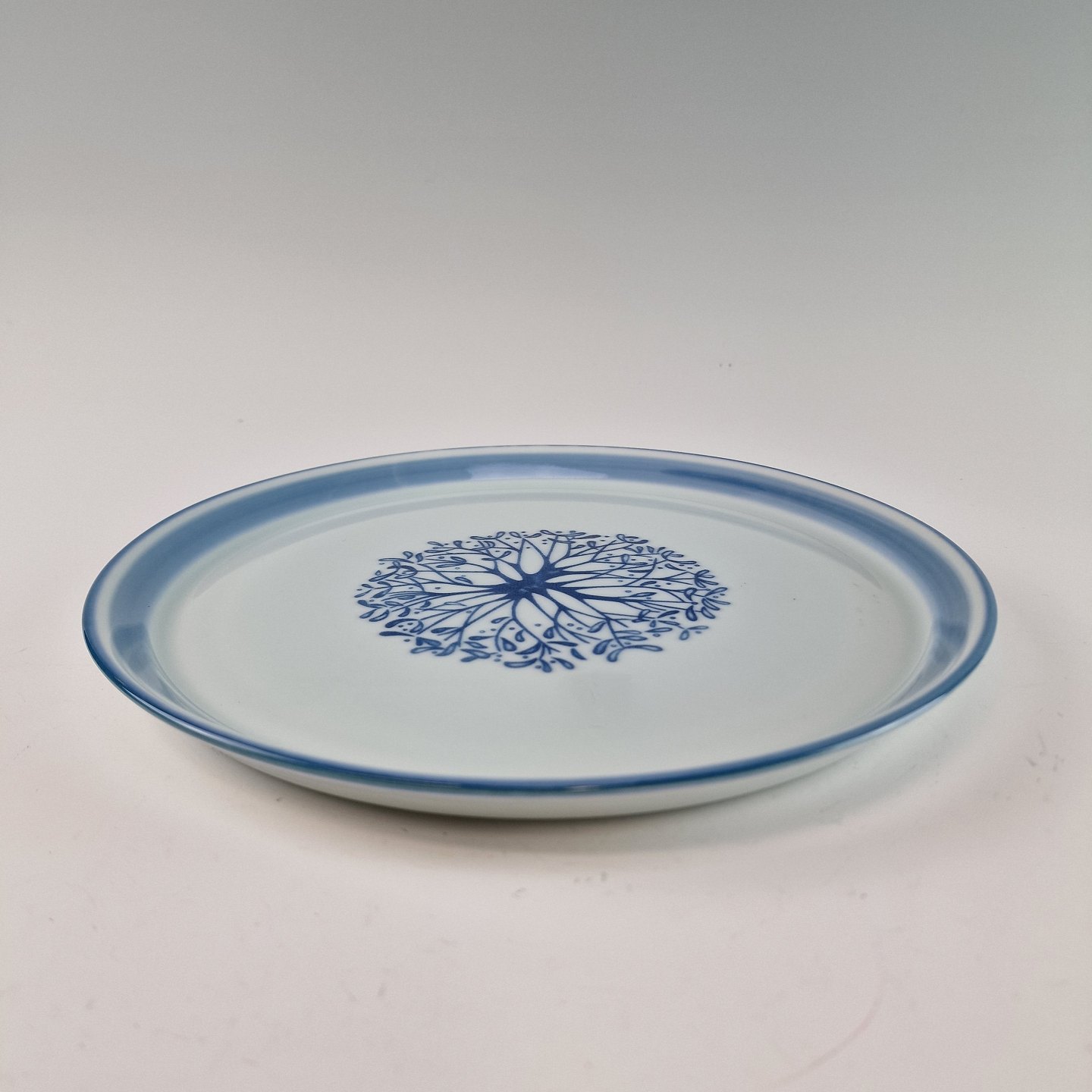Stellets runde former er dækket med en silkeblød glasur og håndmalet med er lys almueblå farve lagt under glasuren. Stellet er ovnfast