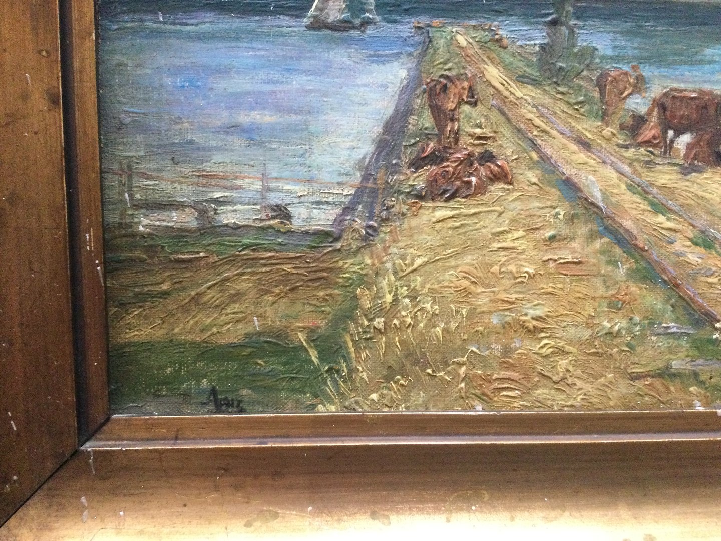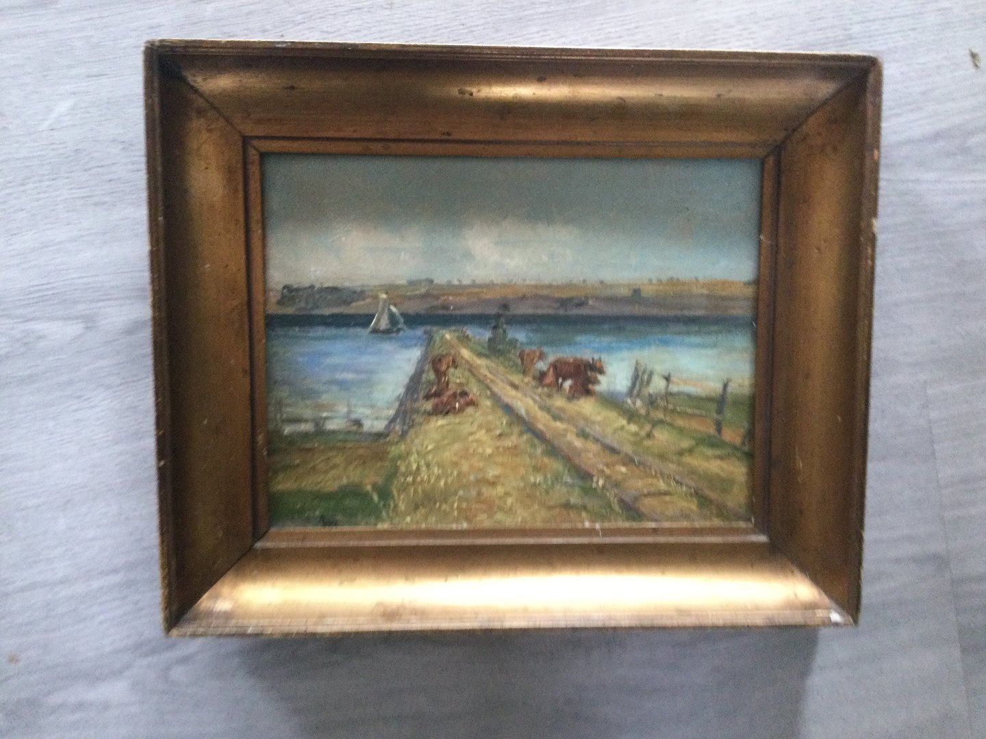 Maleri af Aksel M. Lassen 1917 - Fjordparti med kvier, skib og personer.