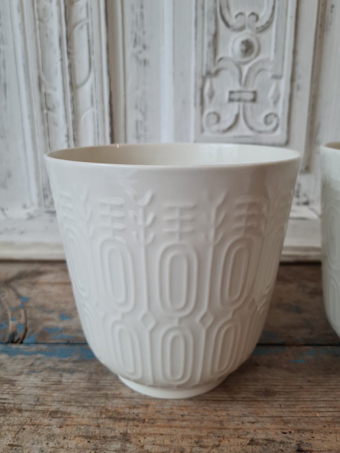 Royal Copenhagen par urtepotteskjulere i Blanc de Chine dekoreret med geometrisk mønster i relief