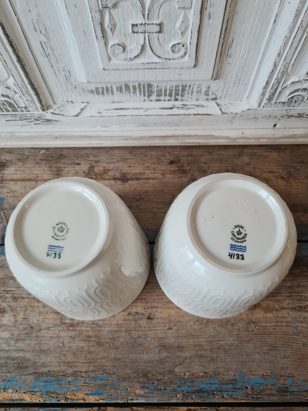 Royal Copenhagen - par urtepotteskjulere i Blanc de Chine dekoreret med geometrisk mønster i relief designet af Thorkild Olsen no. 4133