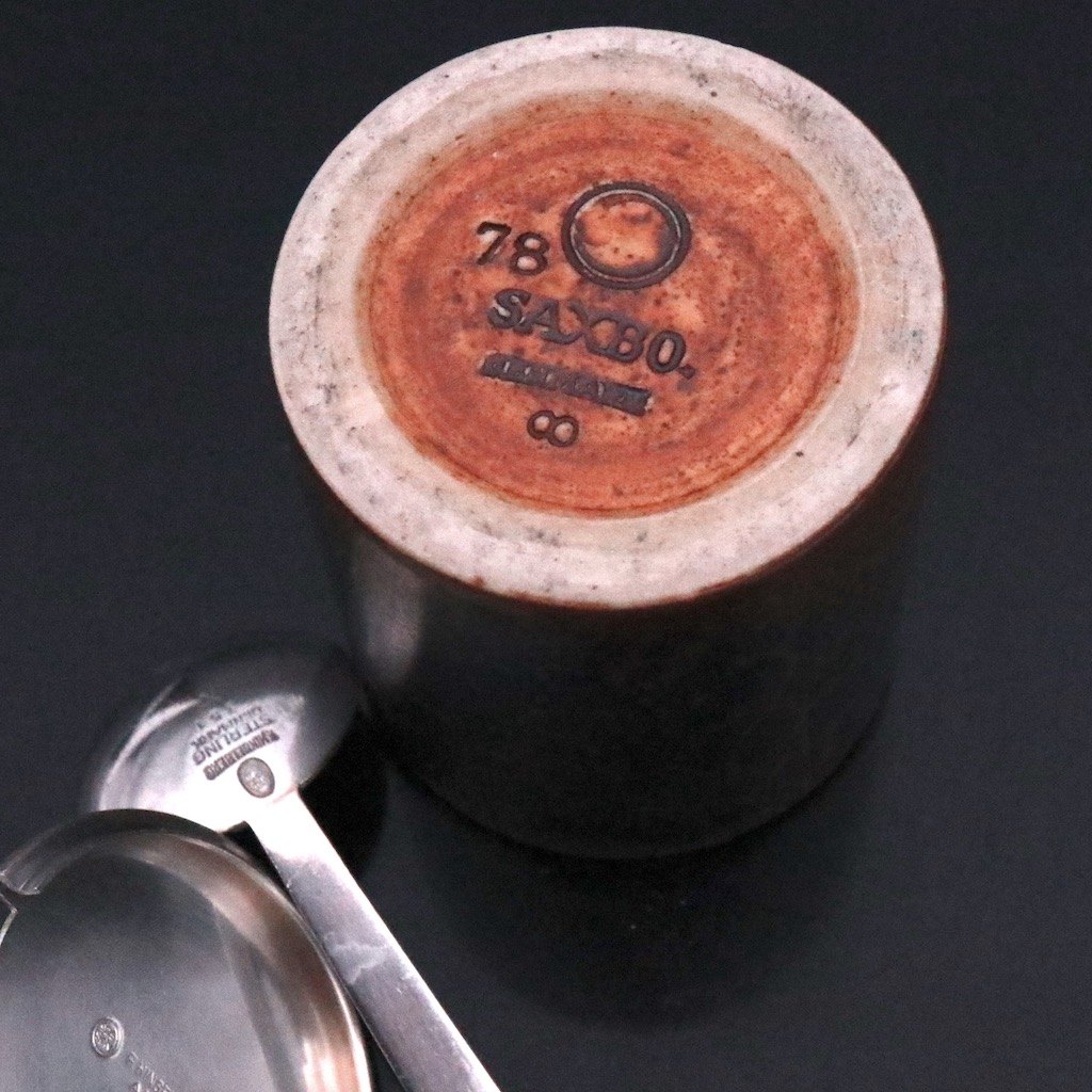 Saxbo - F. Hingelberg. Krukke i stentøj med låg og ske i sterling sølv.