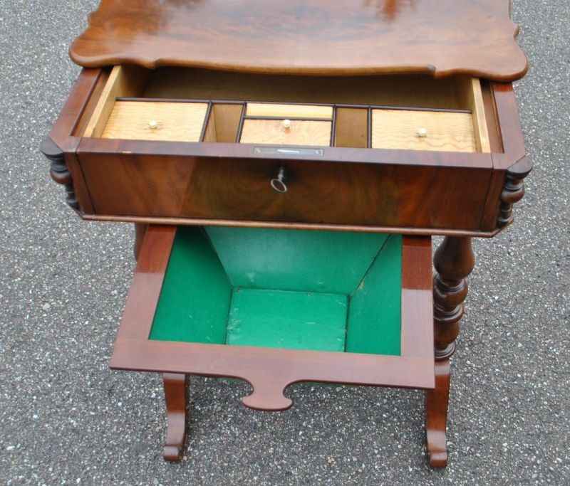 Dansk mahogni sybord, 19. årh. Med udtrækkelig skuffe, hvorunder flere små rum. Øverste plade kan skubbes. Med skuffe til garn. H: 77 cm. D.: 44 cm. B.: 57 cm.