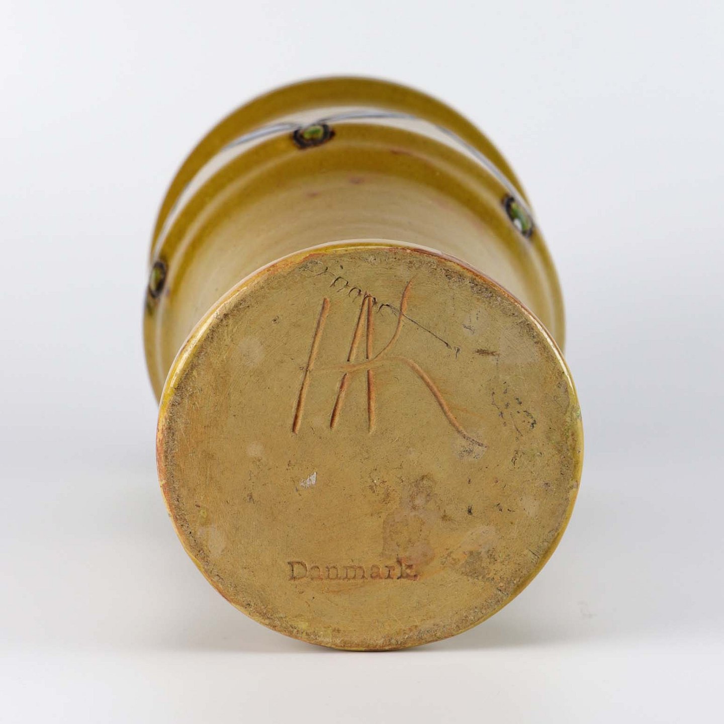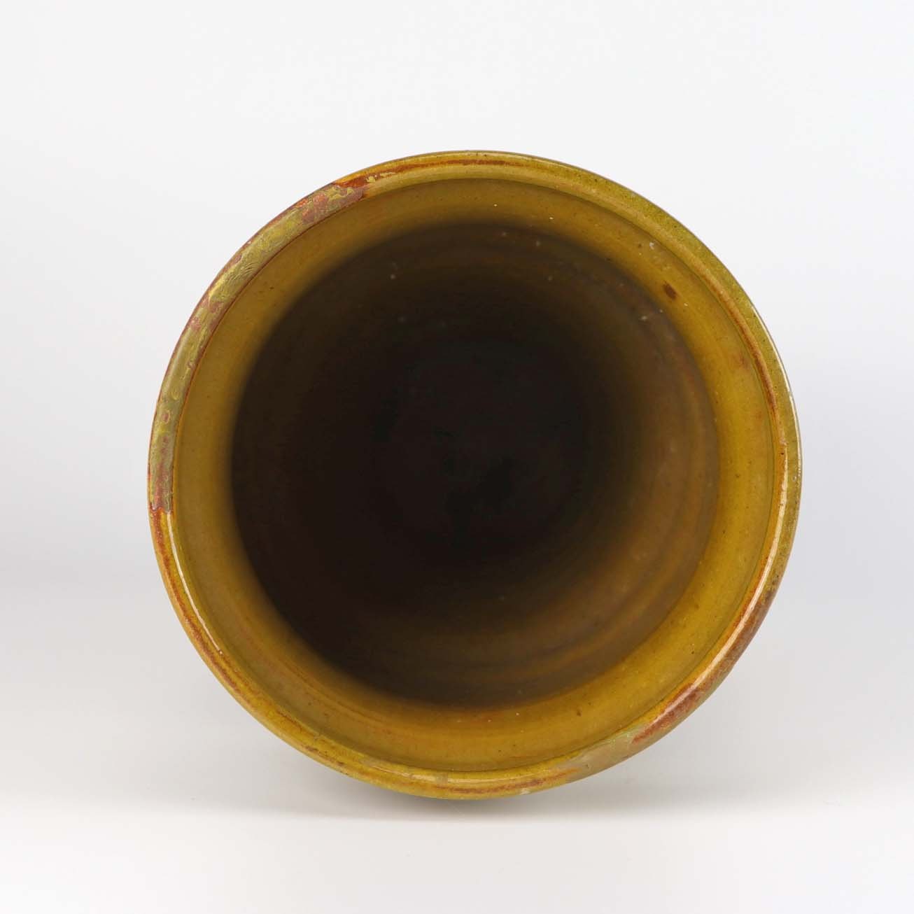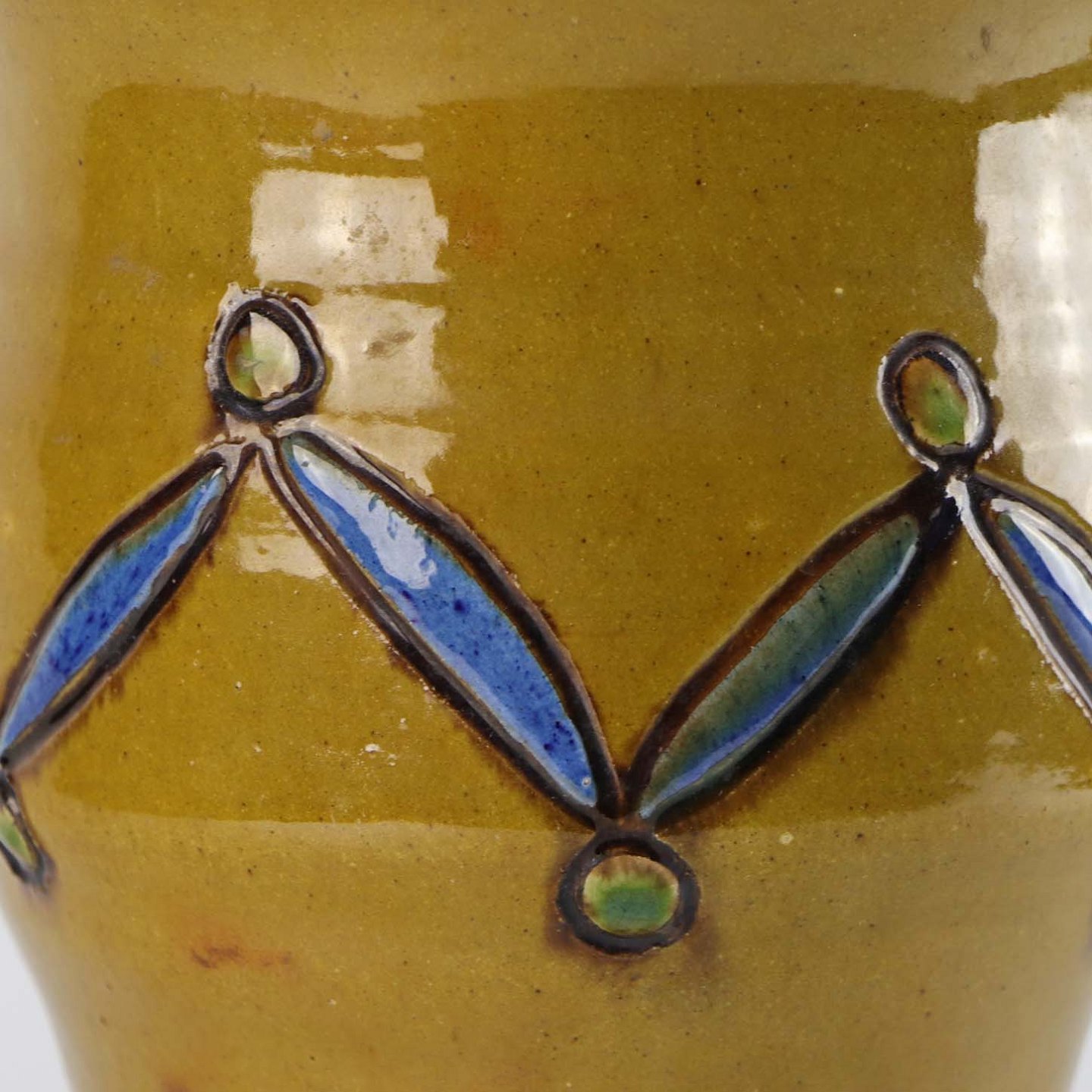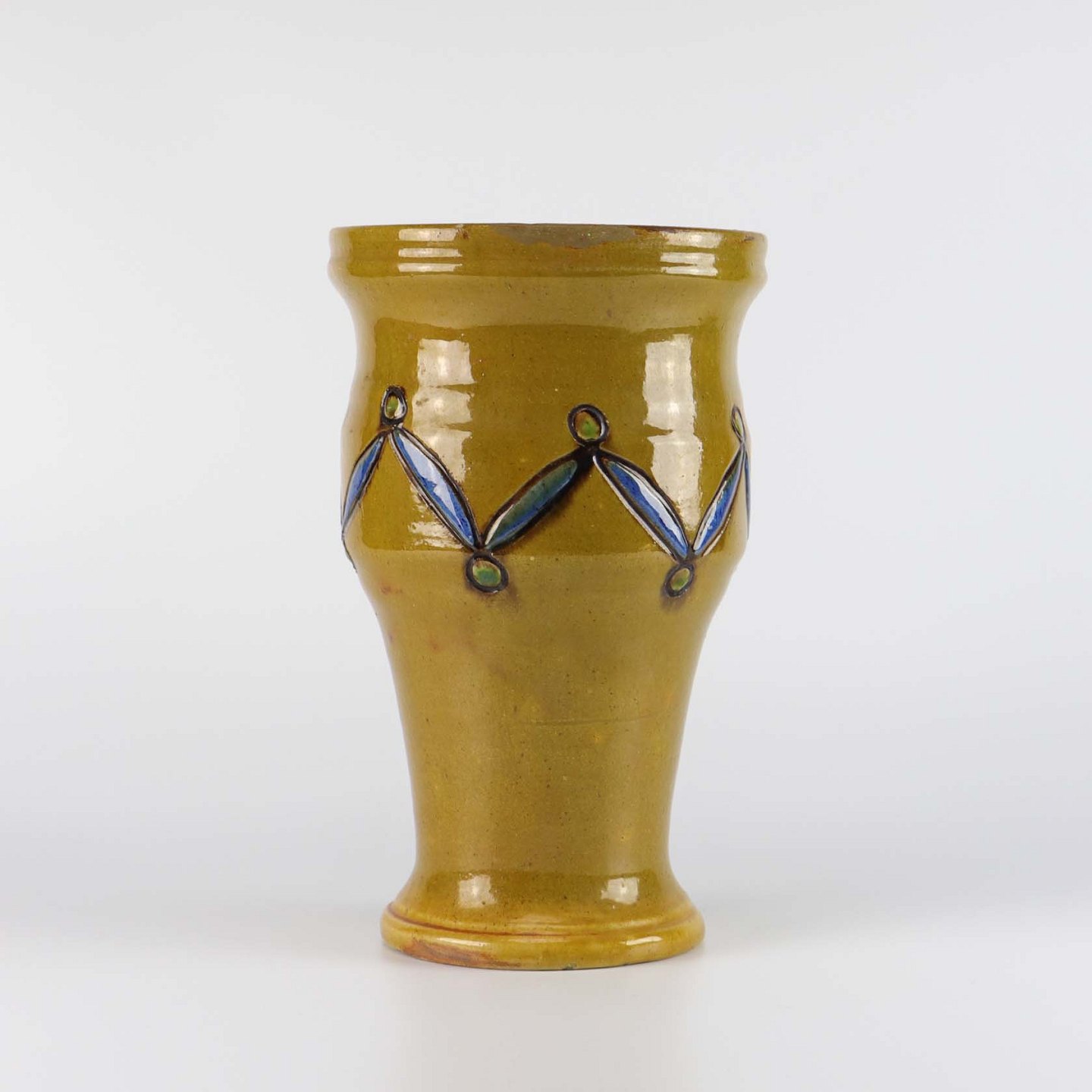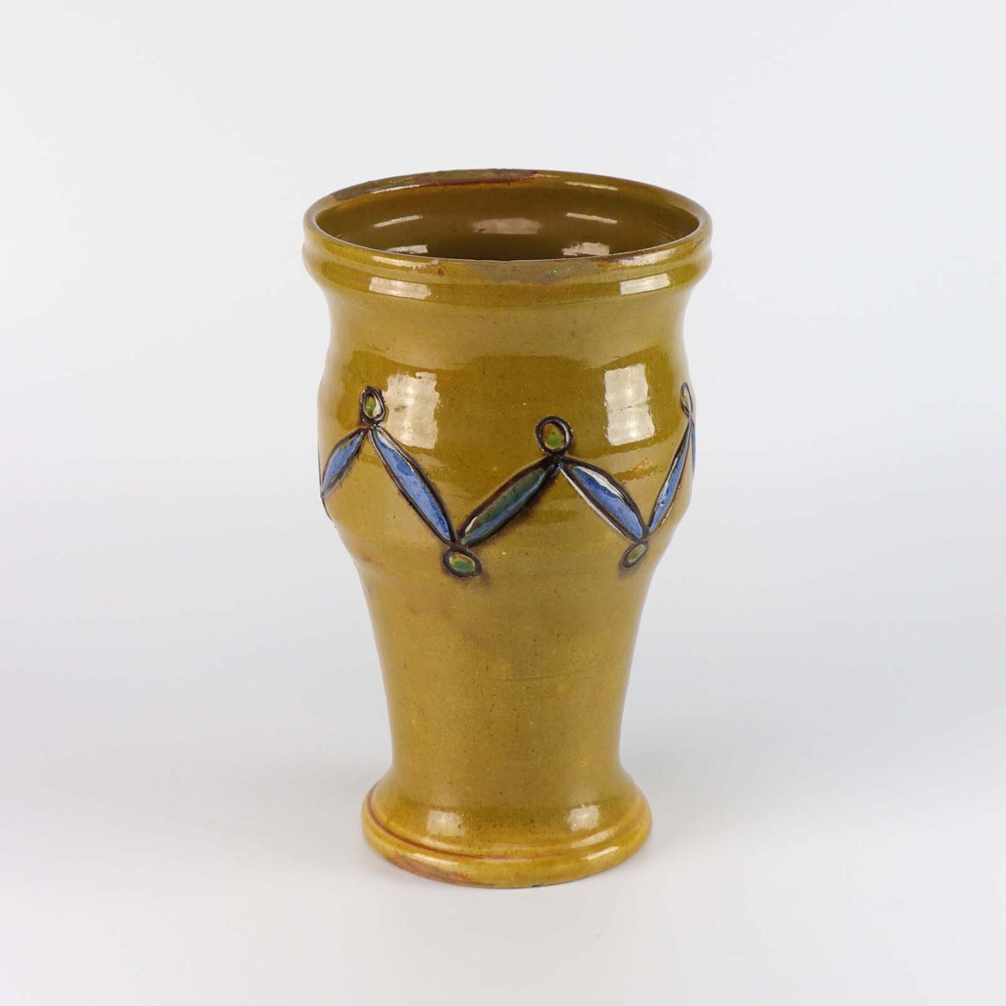 Vase af keramik i gulbrun farve med mønster i blå og grøn