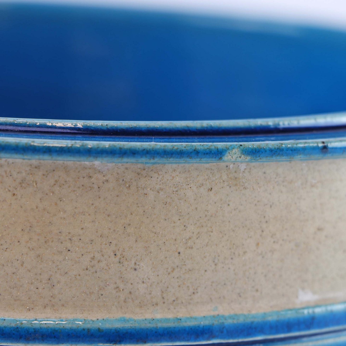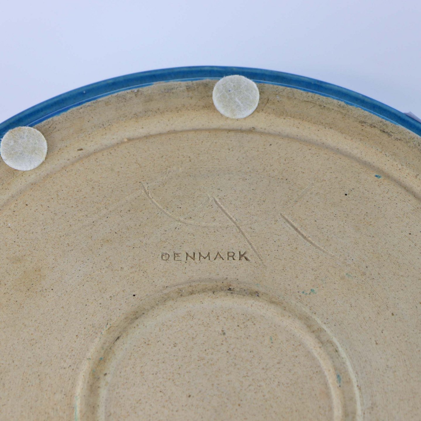 Rundt fad af keramik i hvid med blå glasur. I bunden er afbilledet Greve kommunes våbenskjold