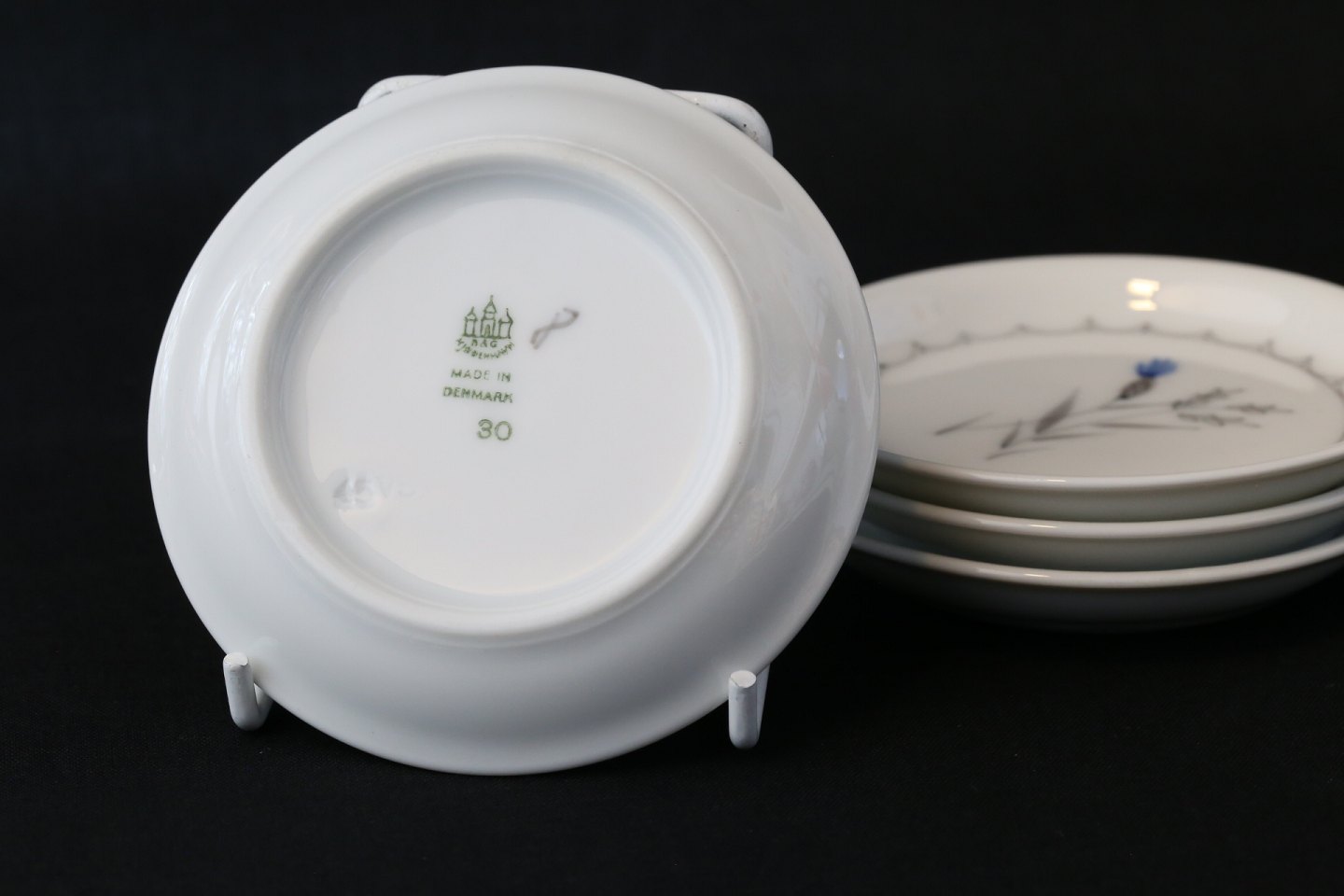 Disse fine små glasbakker i Demeter hvid med kornblomst, passer perfekt til stuebordet, eller til middagsbordet. De er primært egnet som glasbakker, men kan også bruges til andet. De vil især være egnet til stellet "Kornblomst".