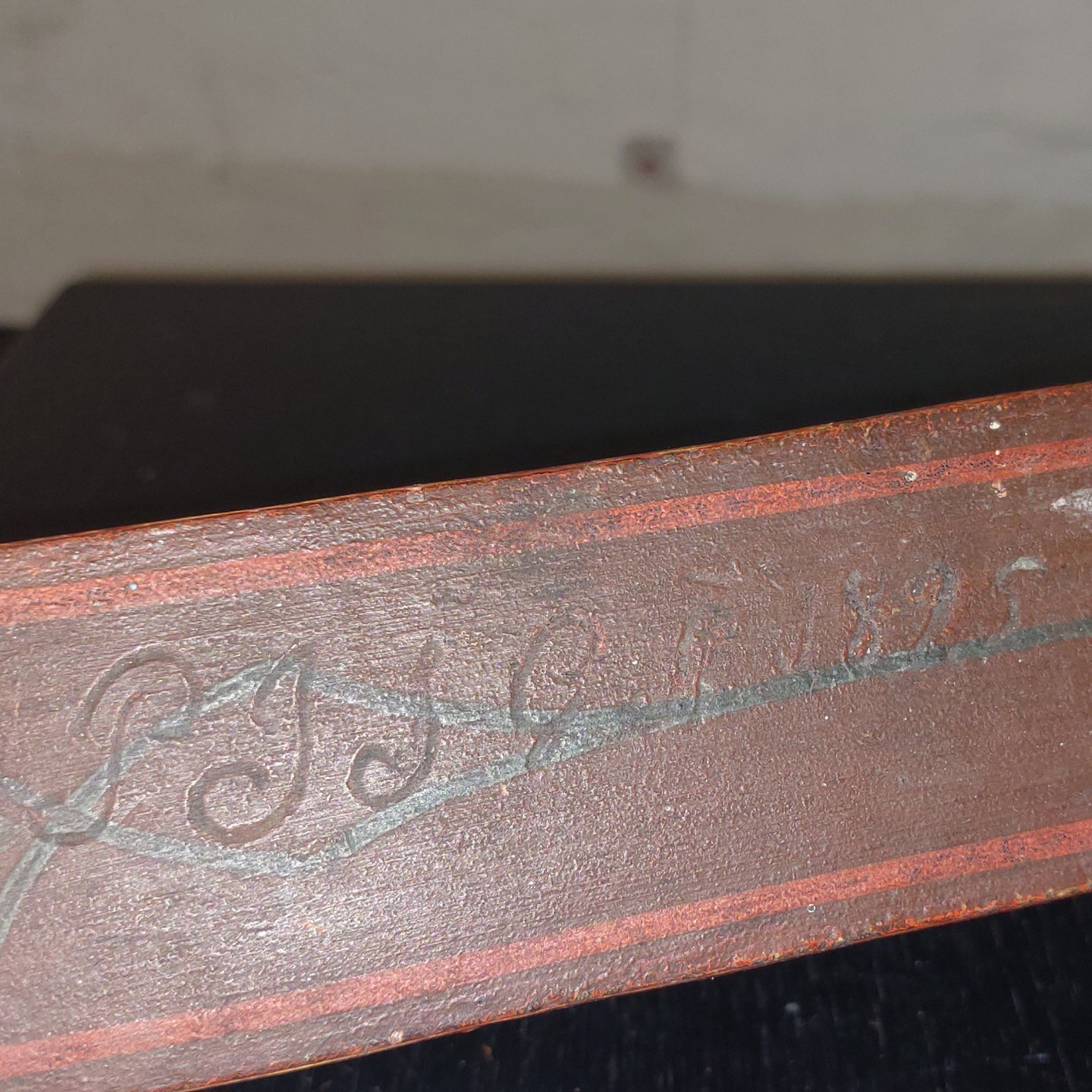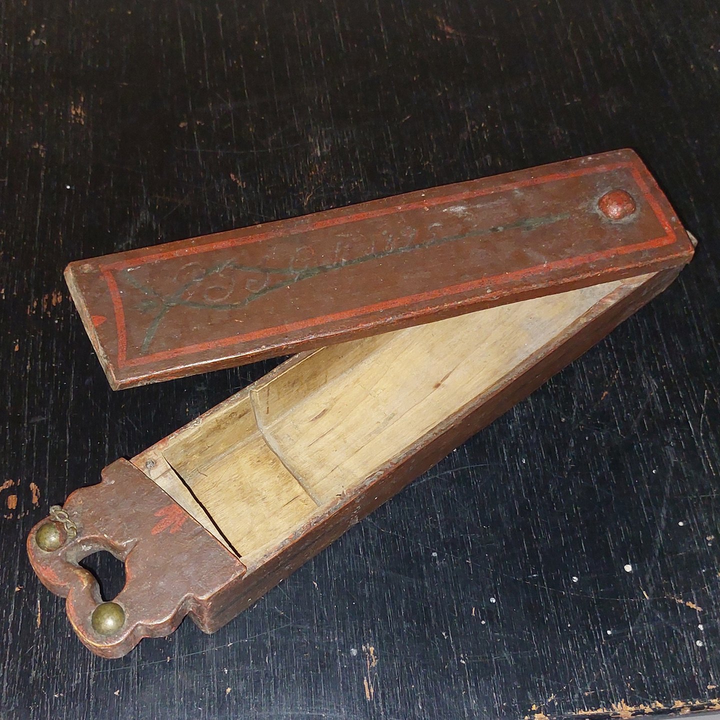 Skandinavisk almue: Penalhus udført i træ. Brunt malet med røde stafferinger. Indridset ejerinitialer samt 1825, som formodes at være produktionsåret. Fremstår I god stand med almindeligt brugsslid. Mål: H. 4 cm L. 27 cm B. 5,5 cm.