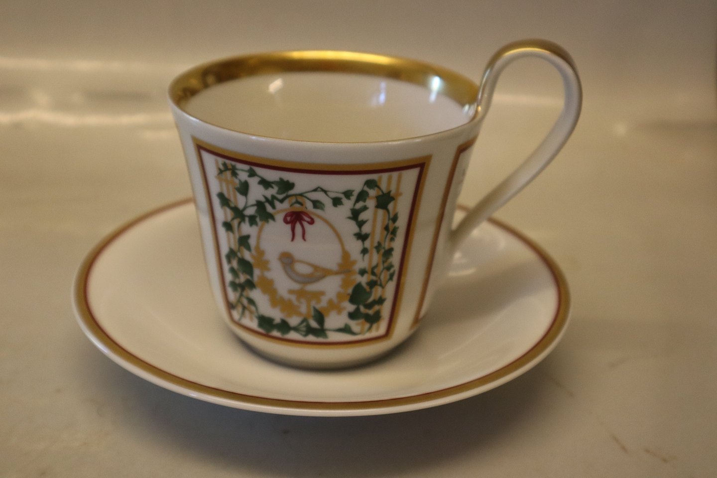 0 x B&G 2002 Julekop med høj hank 9 cm og underkop 15.5 cm (486) Dekoration Jette Frölich: Spurv og mistelten
