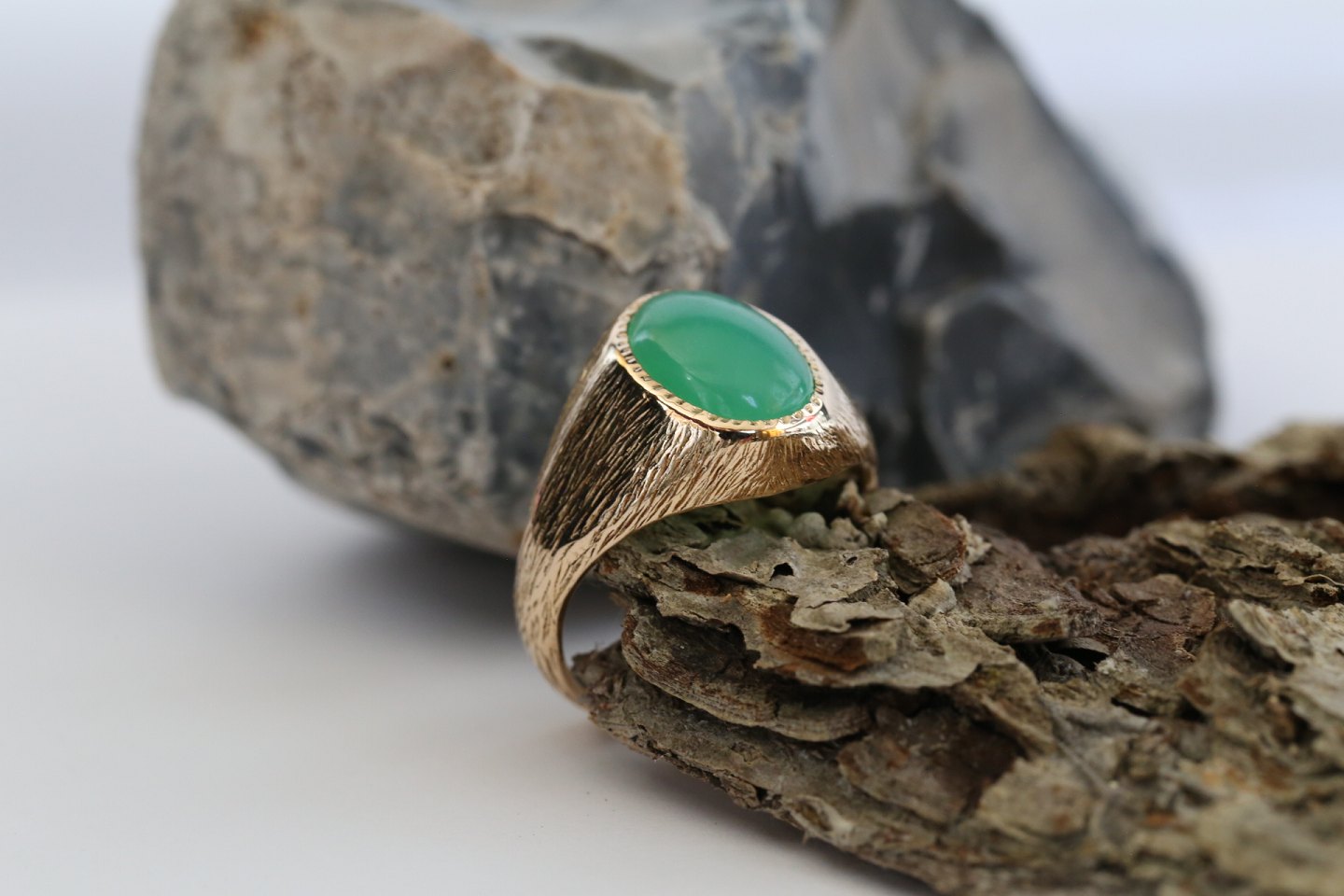 Denne flotte damering er smedet i massivt 14 karat guld, og toppet med en flot grøn sten. Ringen er udført med mange detaljer, hvilket gør ringe eksklusiv og meget smuk.