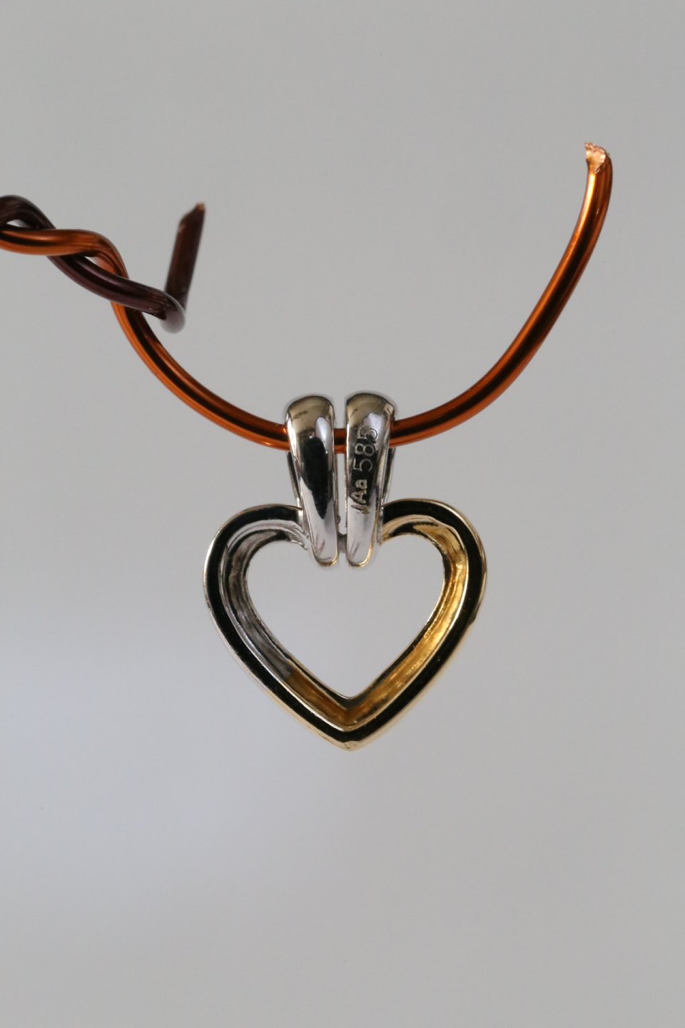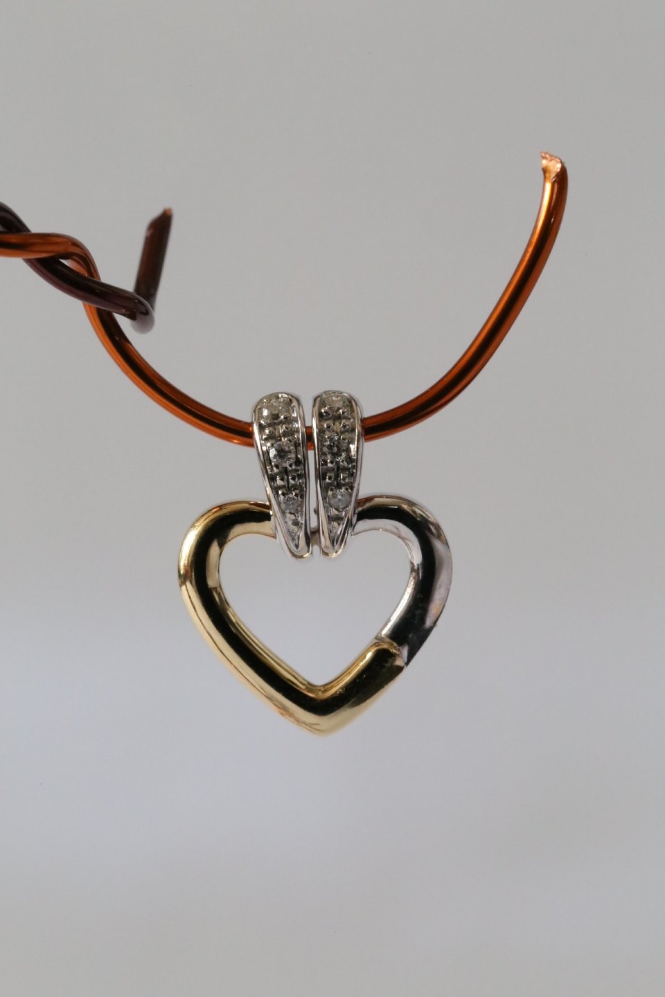 Et meget romantisk og smukt hjerteformet vedhæng, hvor selve hjerteformen udgøres af en linje i hvid- og rødguld. Dette gør vedhænget meget dynamisk. Øsken til kæde har indlagte brillanter, hvilket giver en flot og levende effekt. Et meget smukt vedhæng, til kvinder i alle aldre.