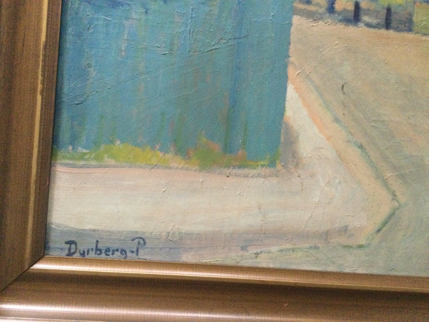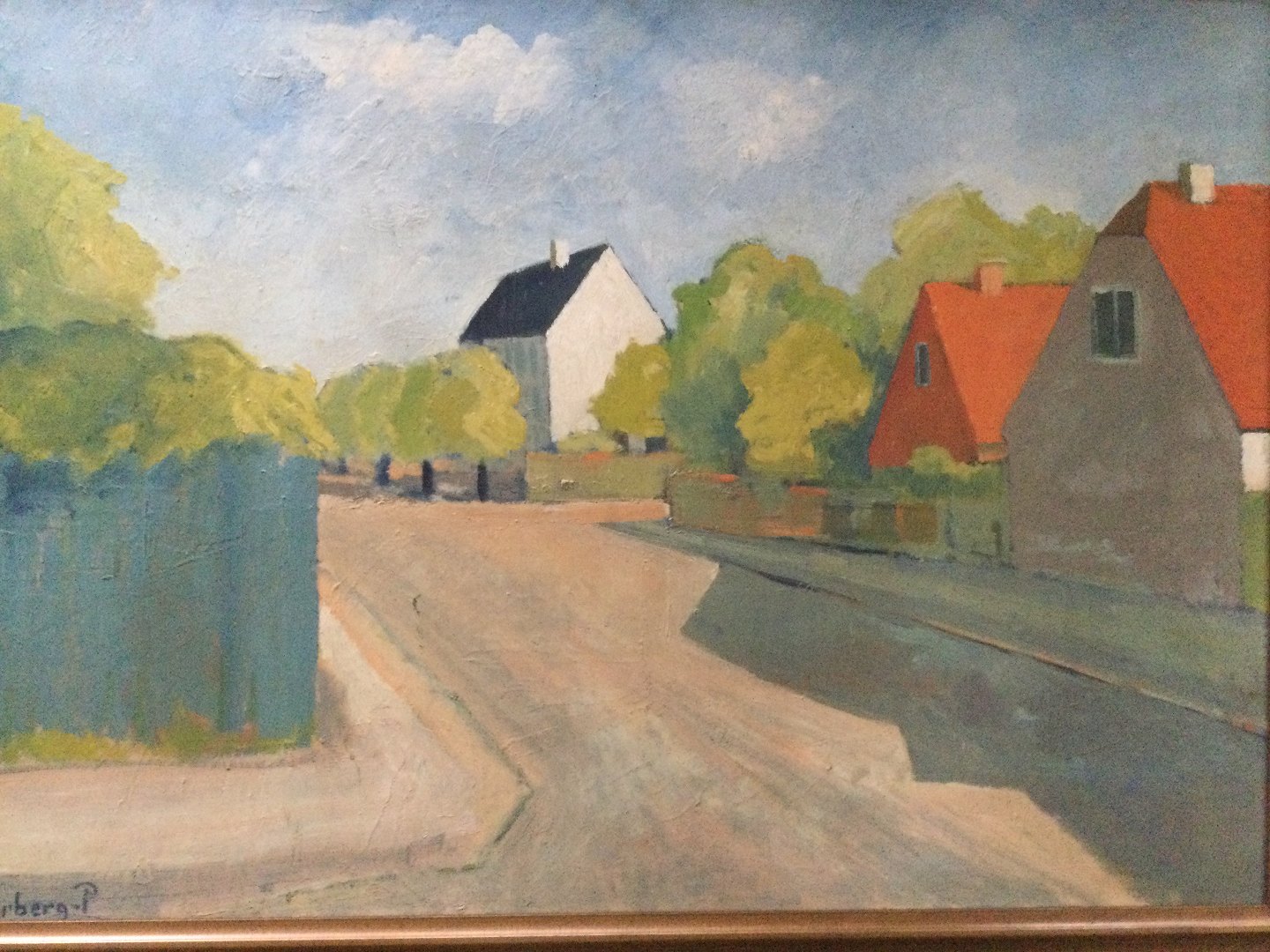 Maleri af Emil Dyrberg-Pedersen - Vej gennem by med Allé træer.