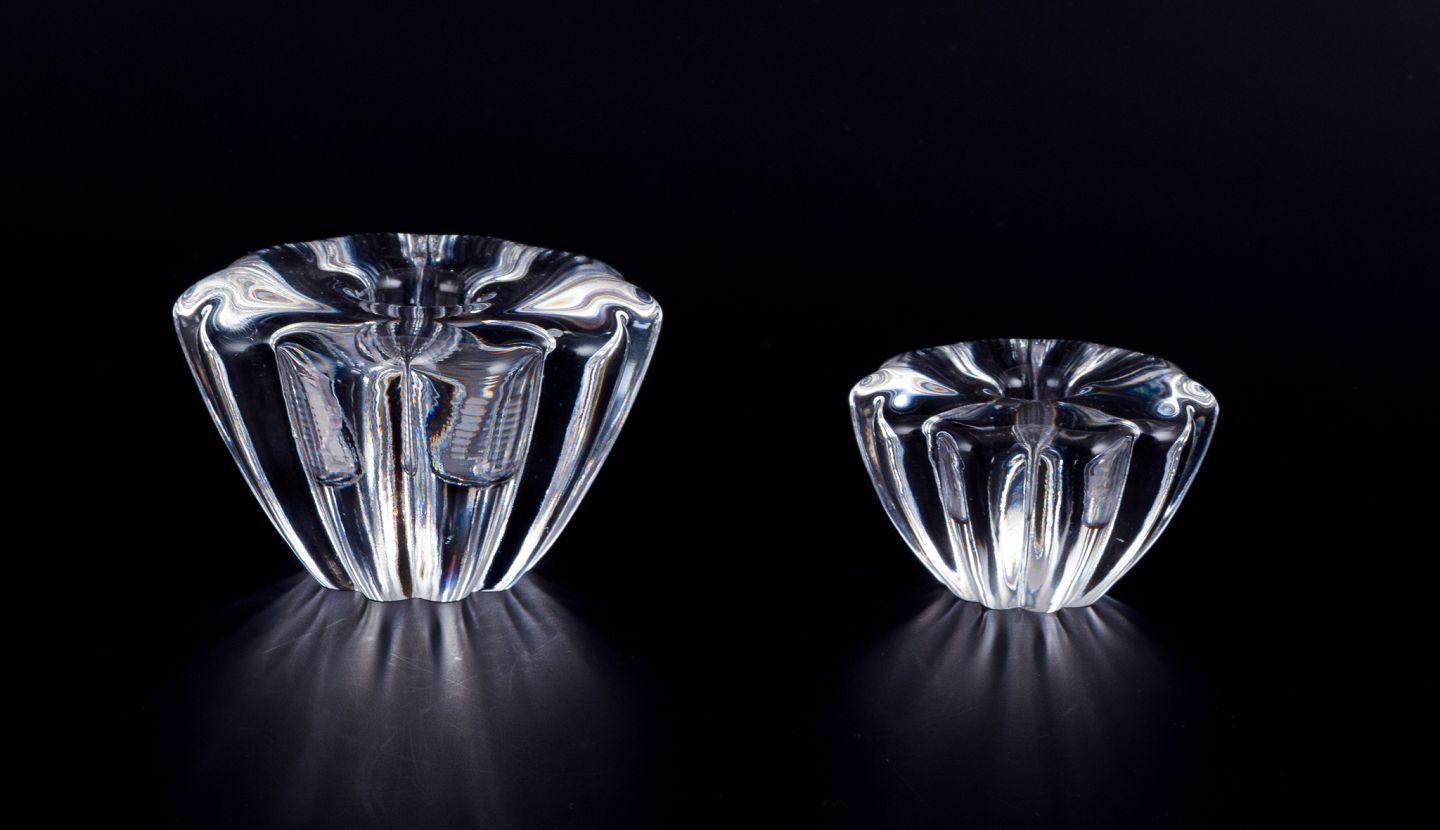 Sven Palmqvist for Orrefors, Sverige. Fire kunstglas lysestager i krystalglas i to forskellige størrelser.
