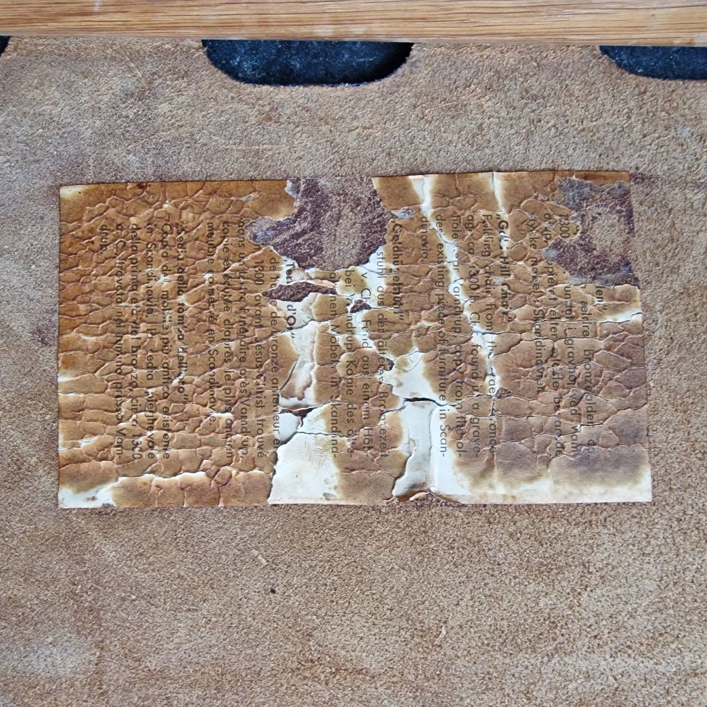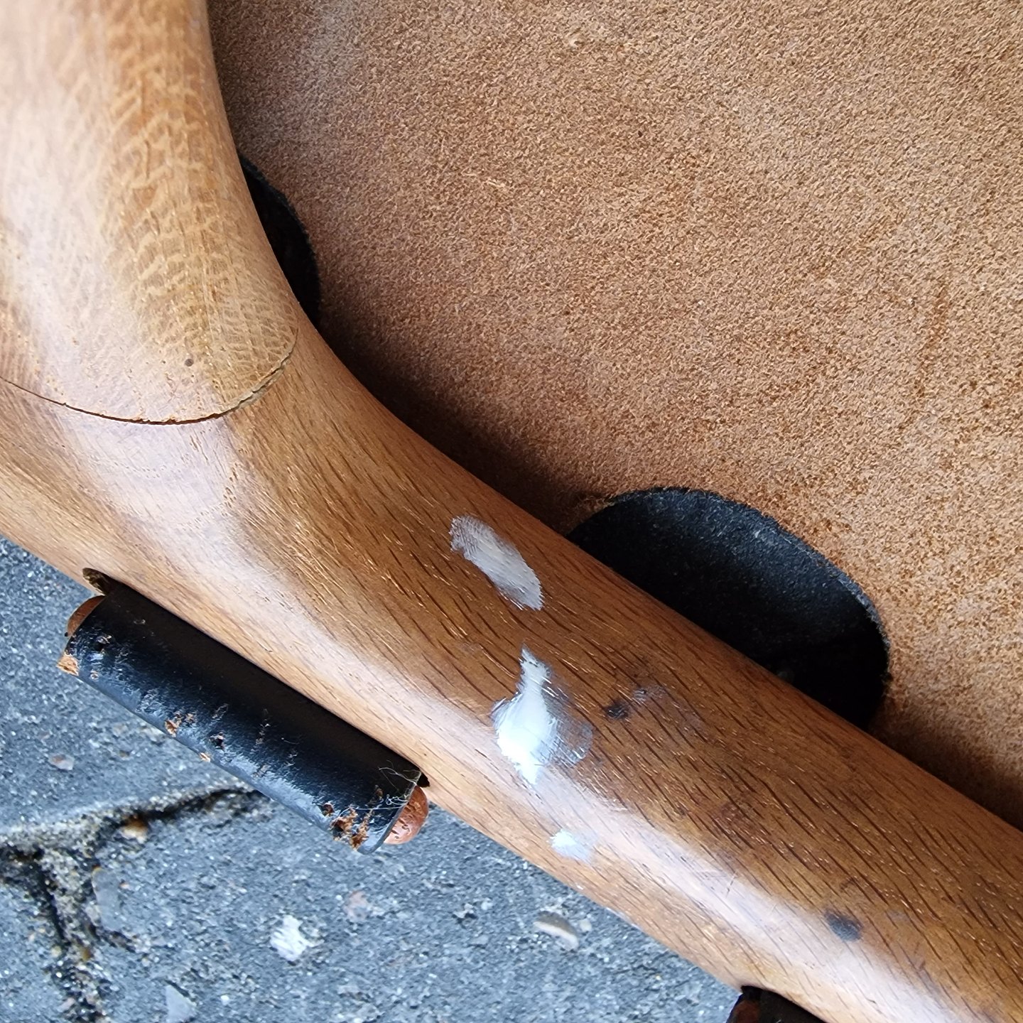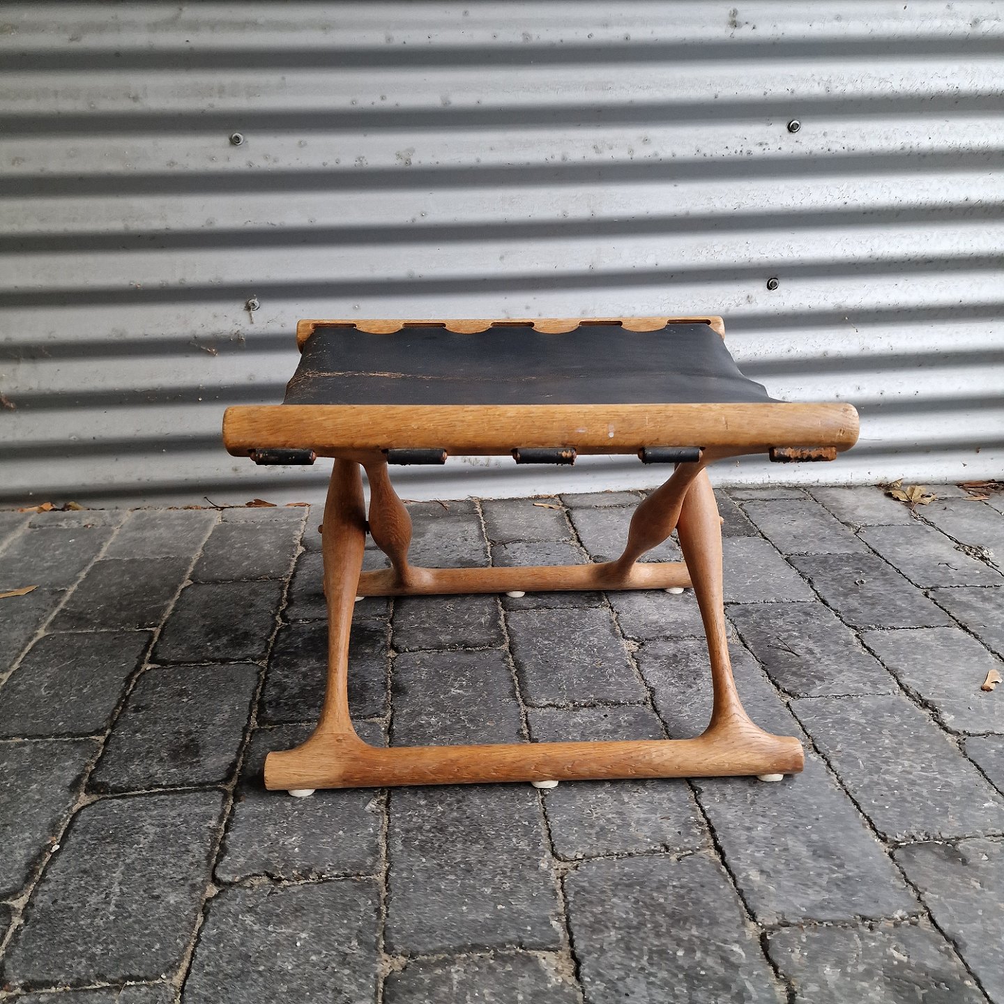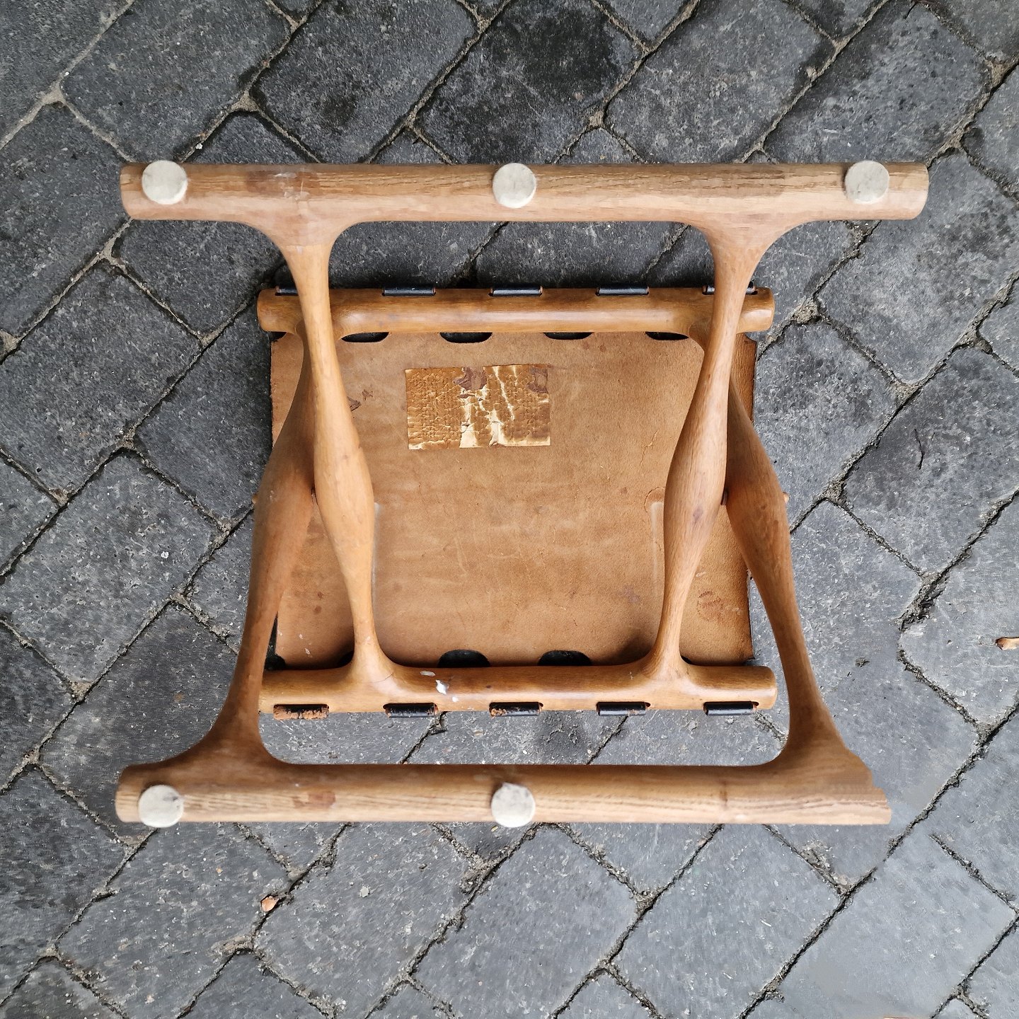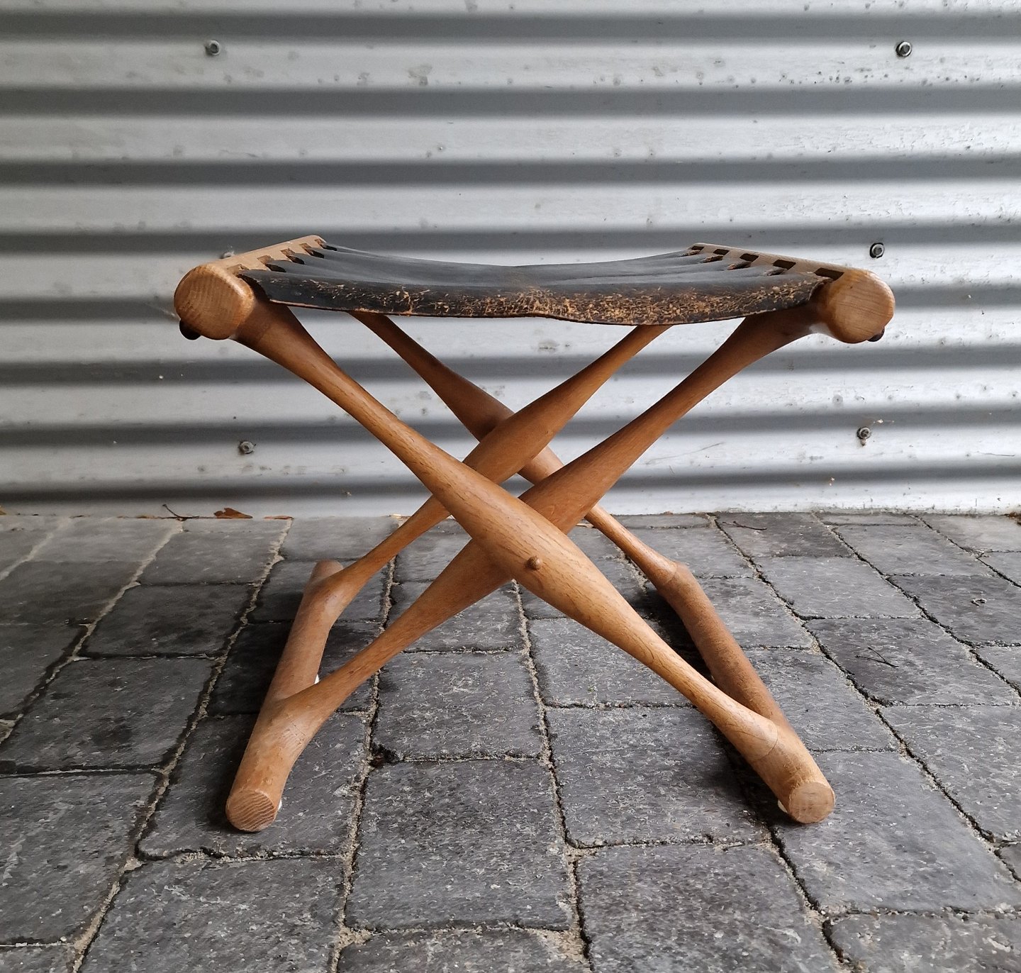 Taburet af ege træ og original patineret læder. Kan klappes sammen