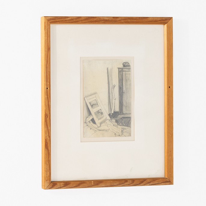 Tegning med hvid baggrund i træramme.