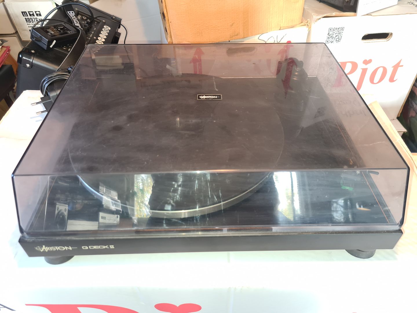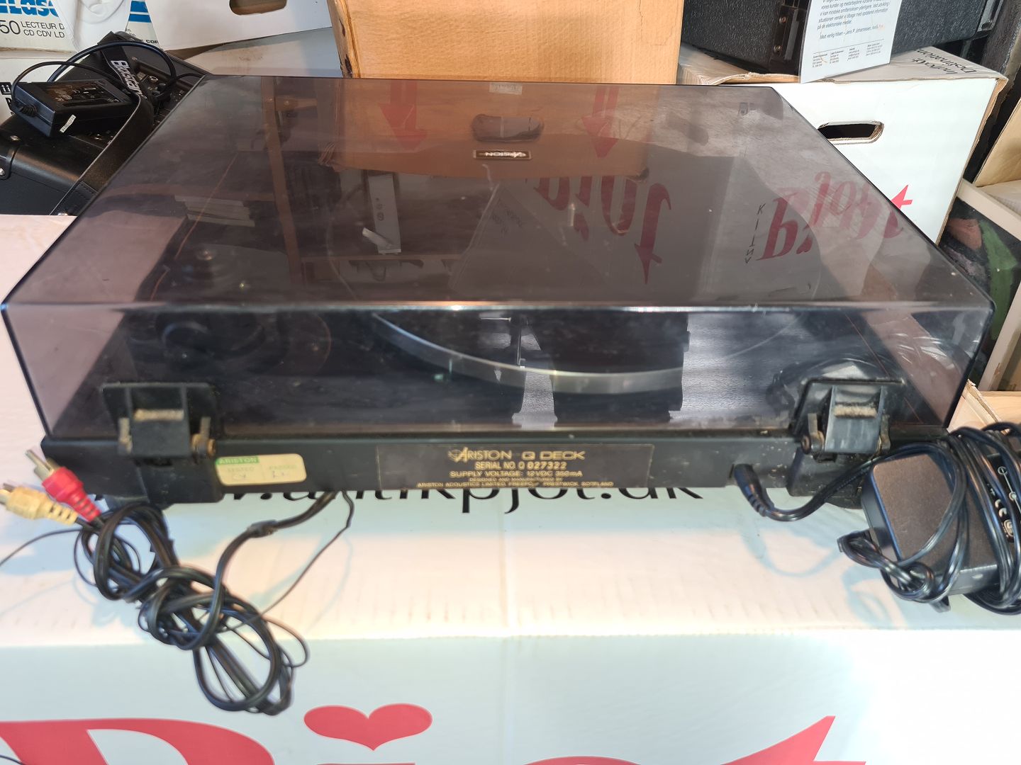 Ariston pladespiller model Q Deck II med ortofon pick´up. Testet og virker. Strømforsyning medfølger, men har brug for en TTPSU hvis den skal køre andet end 33 rpm. Lettere overflade ridset på cover.