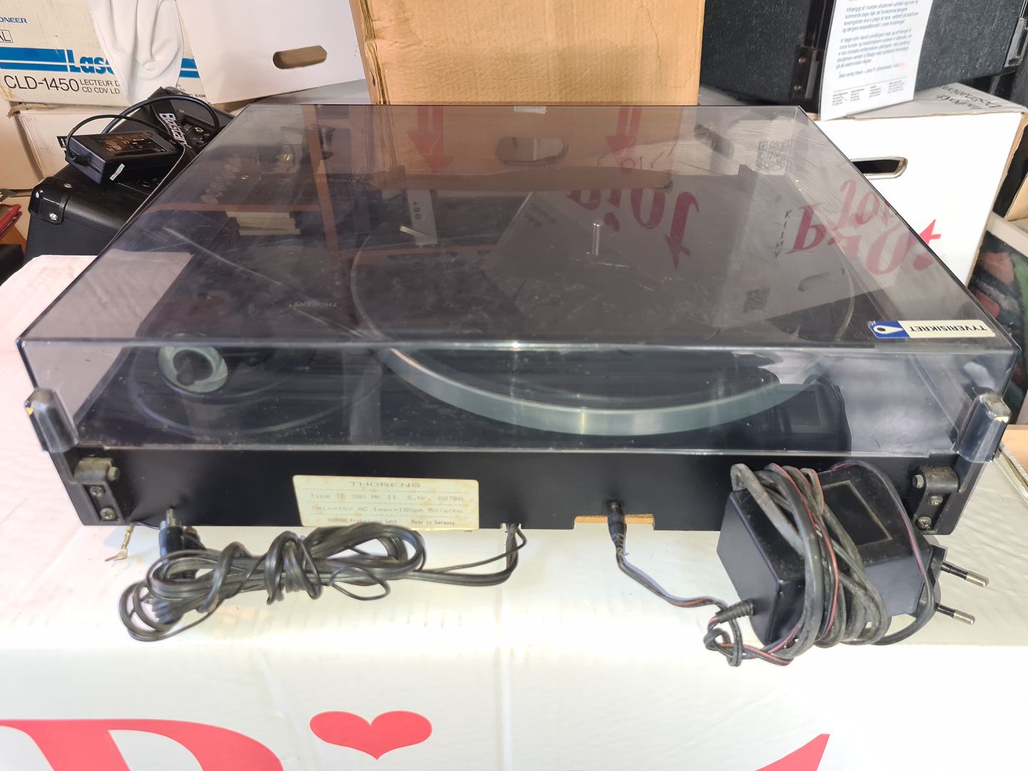 Pladespiller fra Thorens model TD280MkII med ortofon pickup OMB 30. Spiller udmærket på 33 rpm, men har problemer med at komme op på 45 rpm. Hvis den hjælpes op i fart, holder den farten på de 45 rpm.