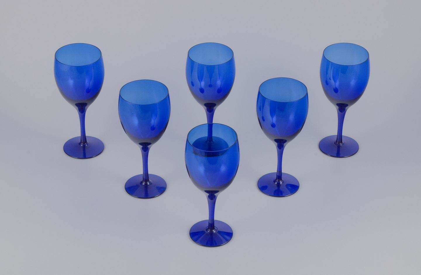 Et sæt på seks rødvinsglas i blåt kunstglas. Håndlavet.