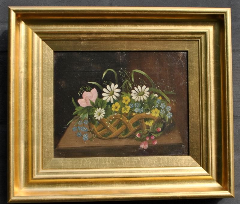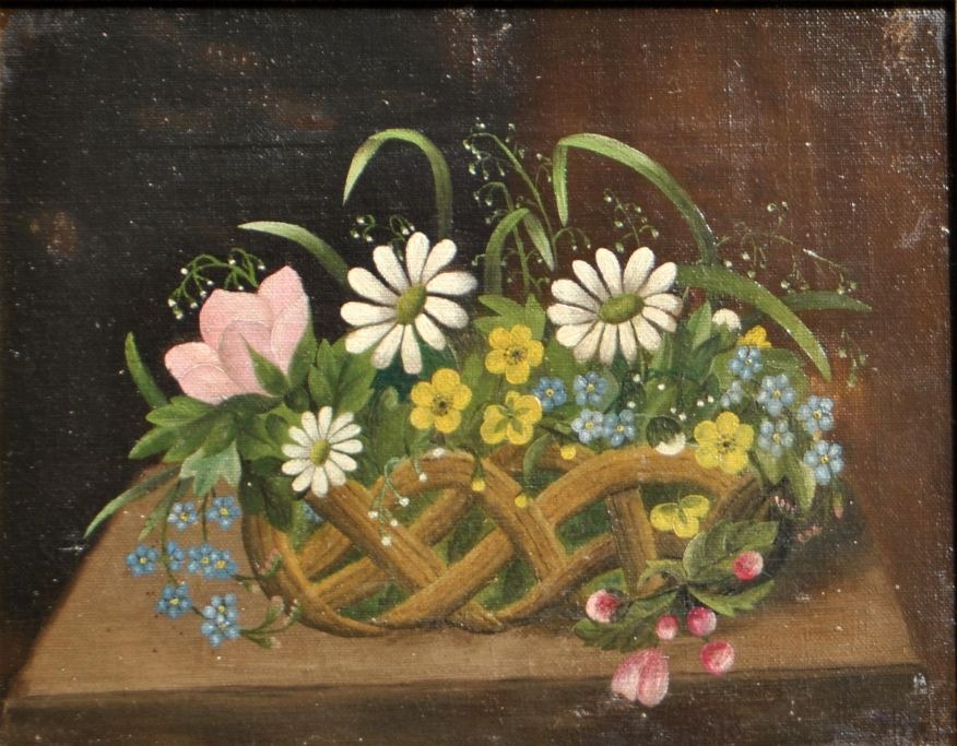 Dansk kunstner (19. årh.): Blomster i en kurv på et bord. Olie på lærred. Usigneret. 22 x 27 cm.