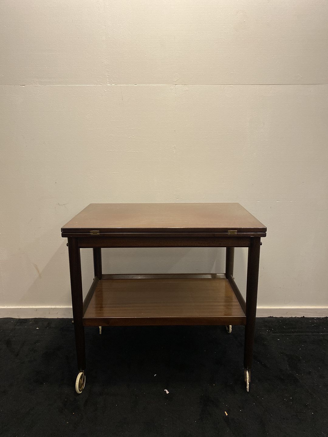 Rullebord i mahogni designet af Ole Wansher til Rungstedlund serien. Fremstår med lettere solbleget bordplade og defekte hjul. (billede)