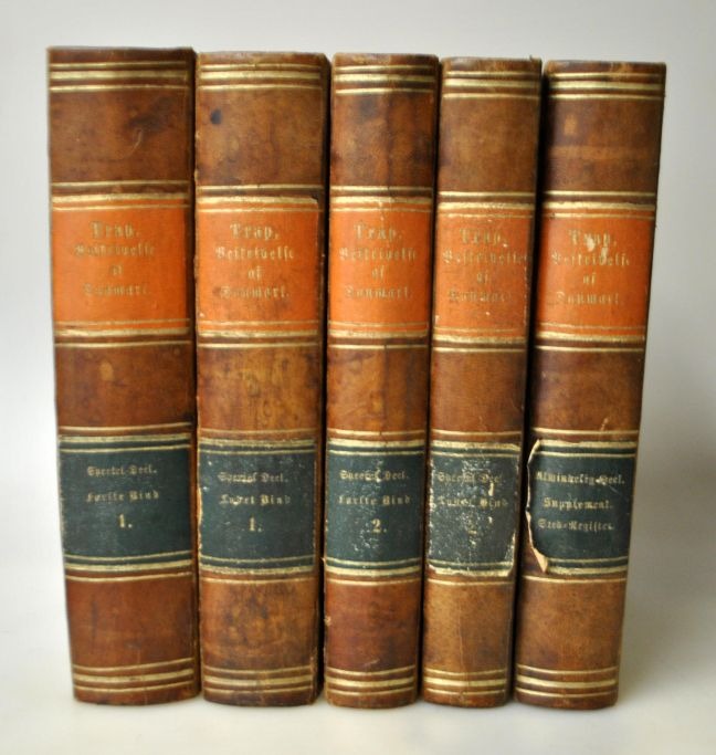 Trap Danmark. Statestistisk, topografisk beskrivelse. Udgivet af Trap, København, 1860. 1. udgave. 5 bd. Med læder ryg. Med utallige litografier og stålstik.  Flot stand!