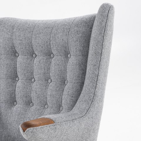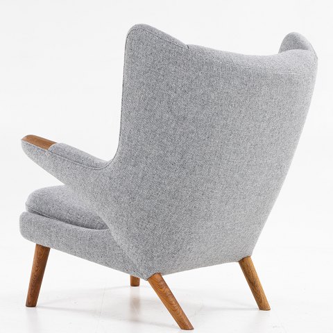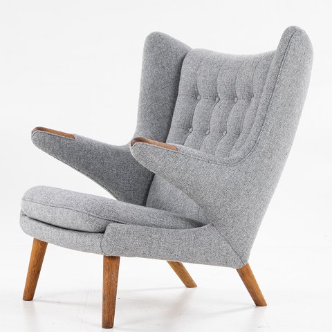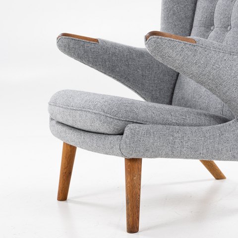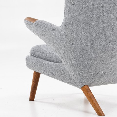OM MØBLET: Dette er en original ’Bamsestol’ af Hans J. Wegner, som er produceret hos den oprindelige producent; AP Stolen. Stolen er brugt, men er nybetrukket af vores erfarne polstrerværksted i Danmark. Den fremstår som ny og har 2 års garanti. Den tilbydes med læder og/eller tekst
