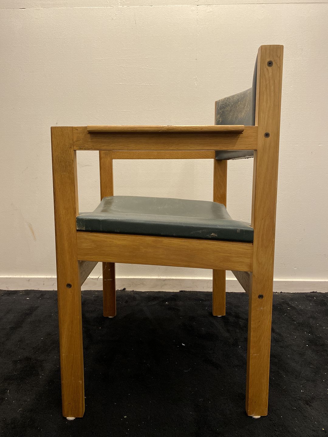 Armstol i eg med læderbetrukket ryg og sæde. Fremstår stabil og ok velholdt dog med lettere brugspor på læder. (billede)
