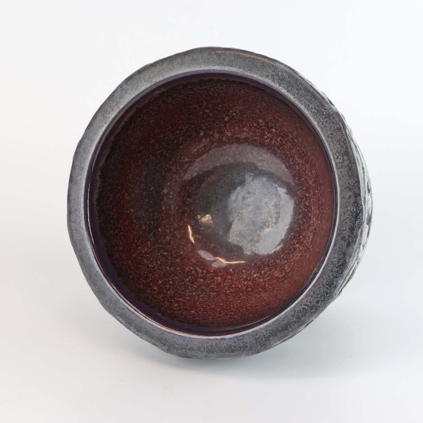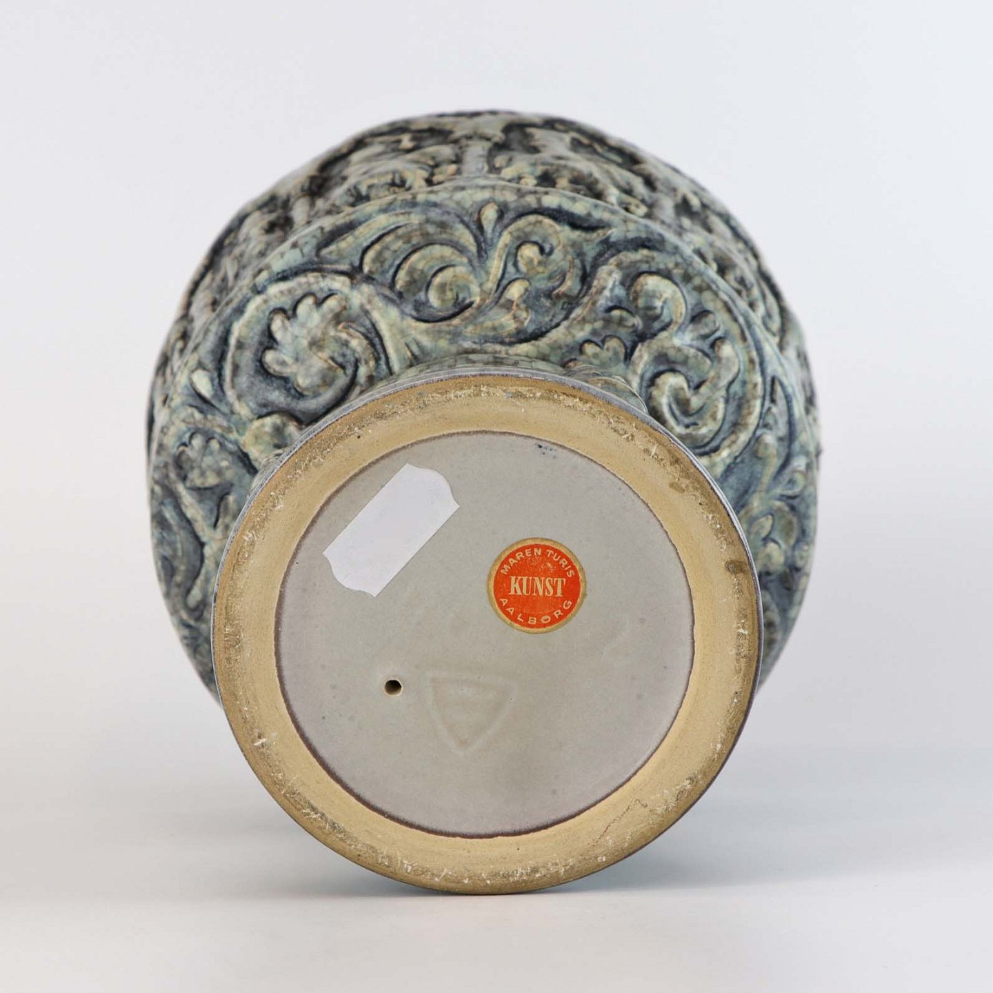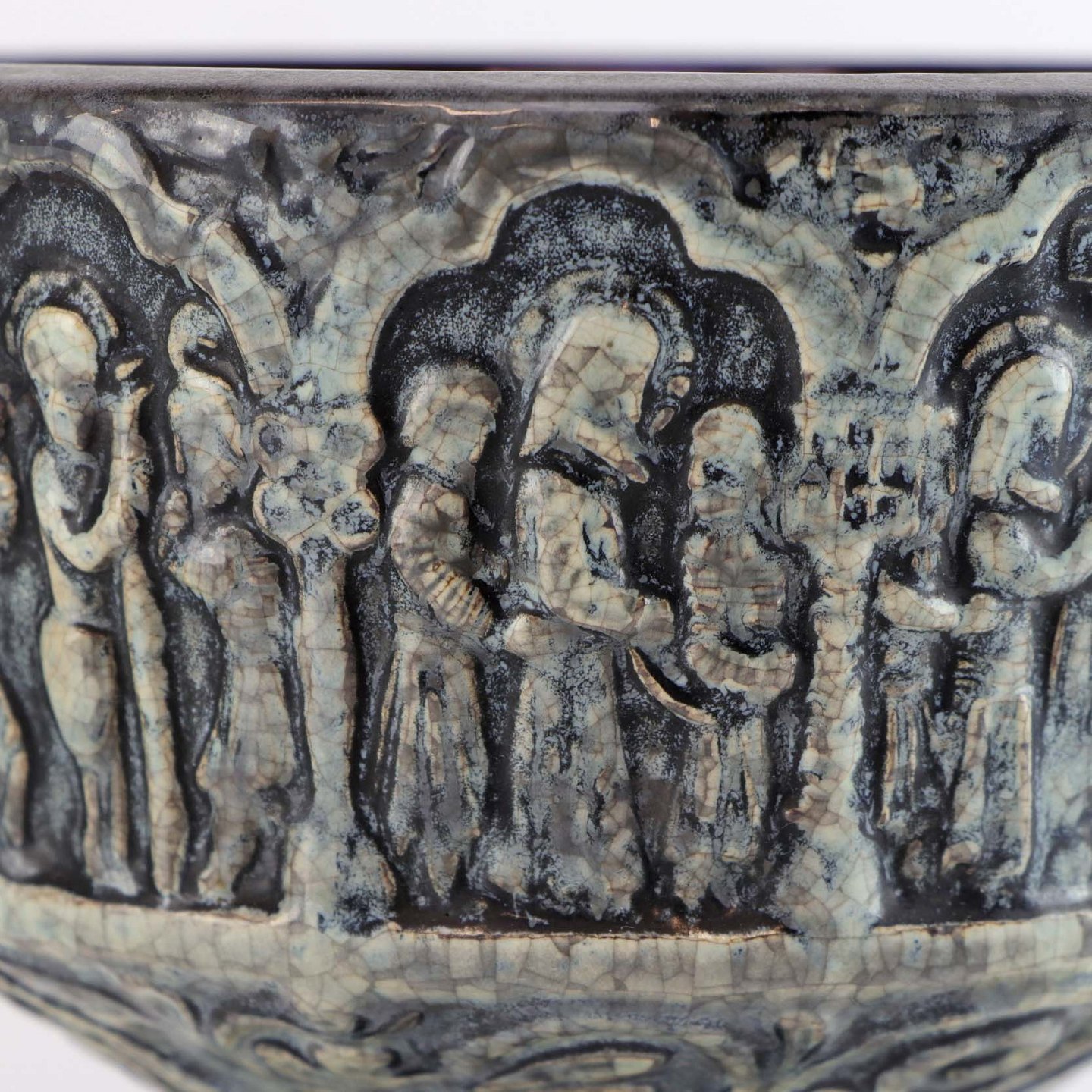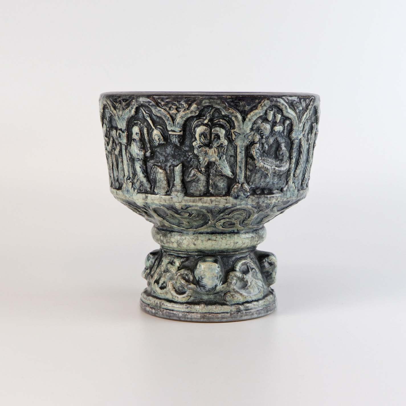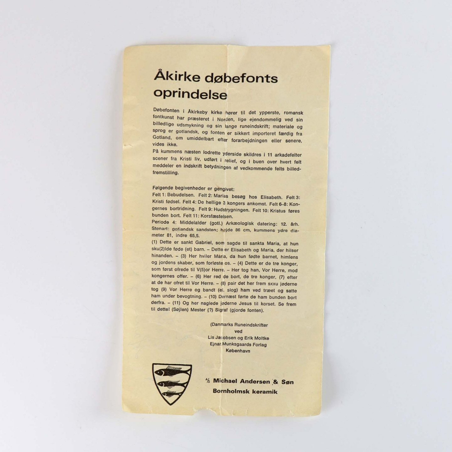 Kopi af Åkirke døbefont i keramik, med scener fra Kristi liv afbilledet på ydersiden.