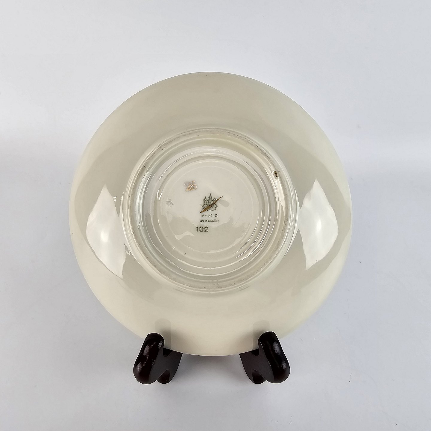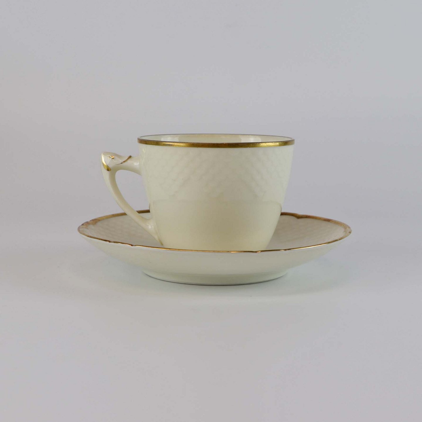 Åkjær er cremefarvet porcelæn med guldkant og mønster som ligner skæl