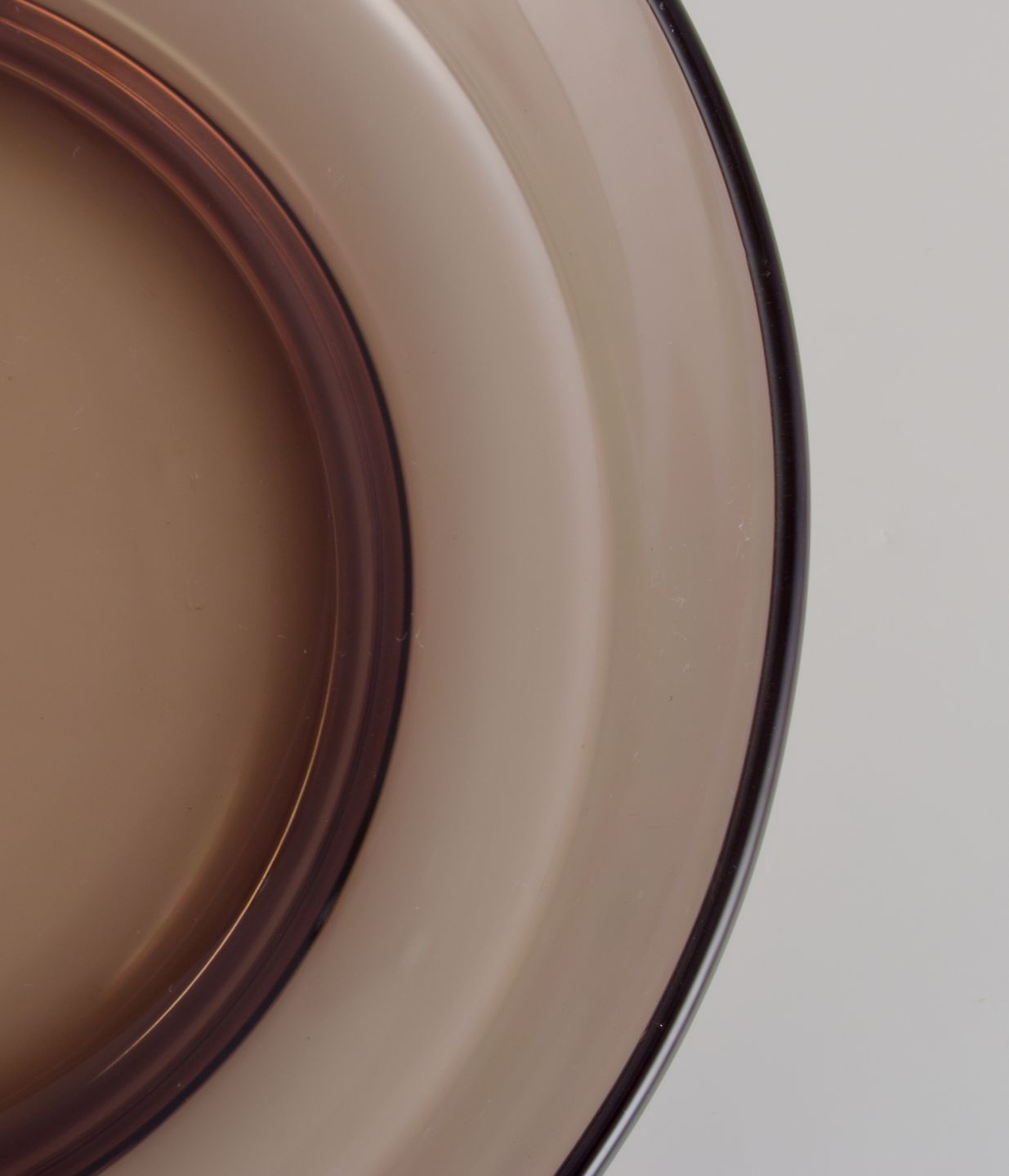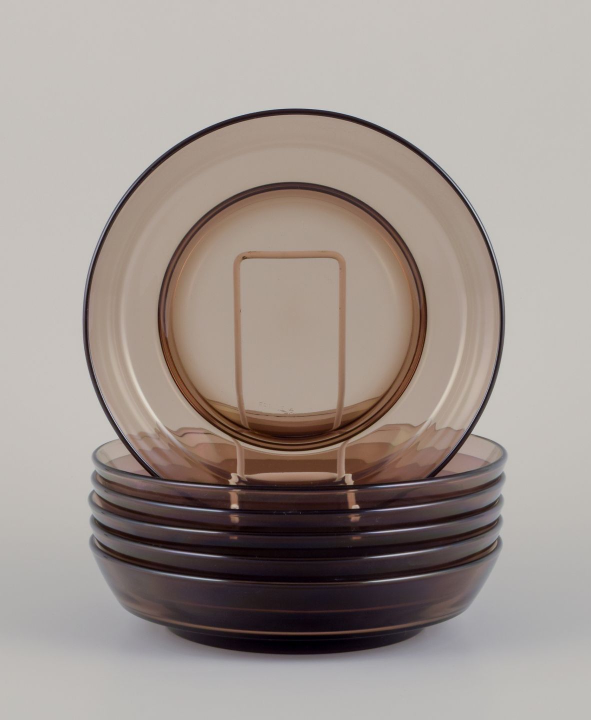 Vereco, Frankrig. Et sæt på seks dybe tallerkner i røgfarvet kunstglas.