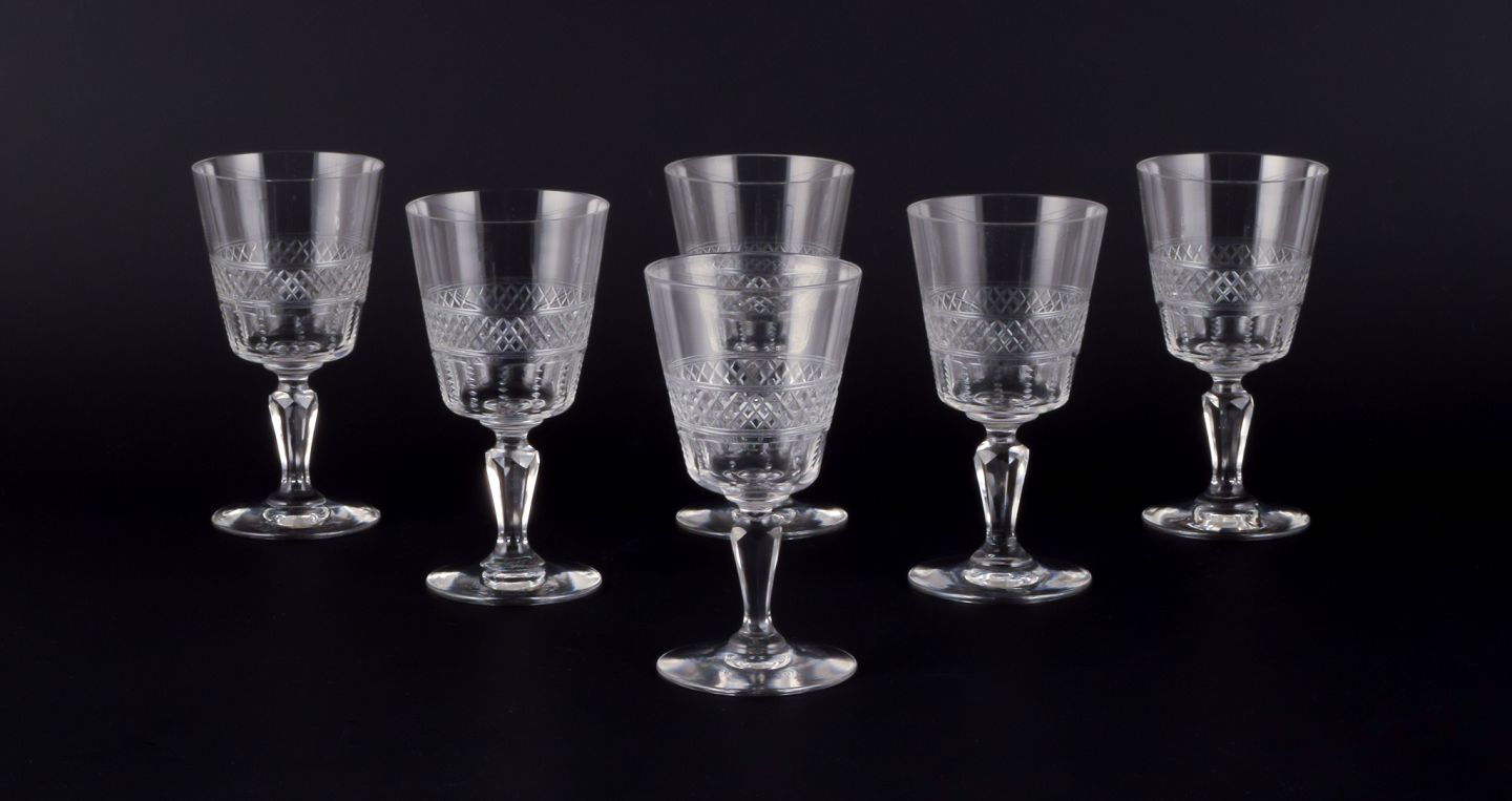 A set of six mouth-blown French white wine glasses in crystal glass. Faceted cut.