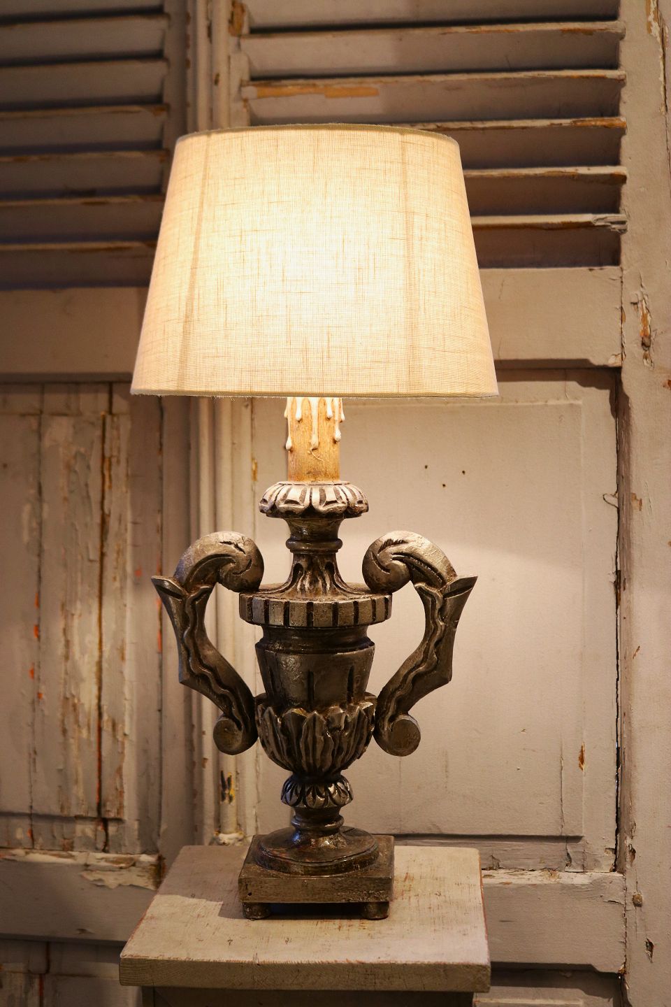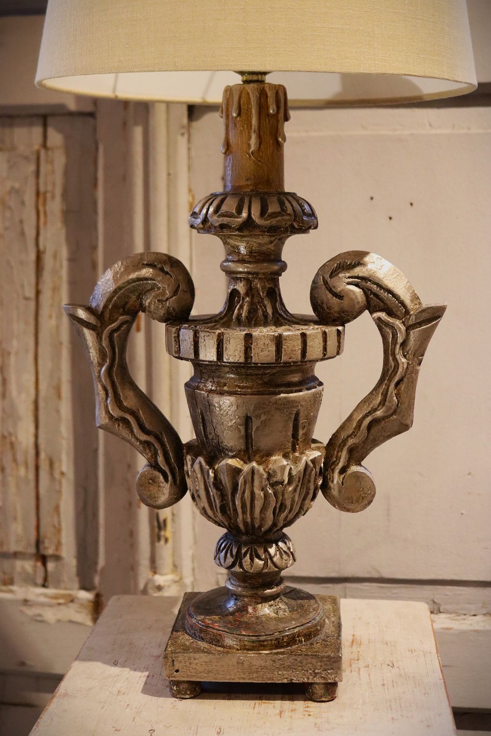 Gammel fransk bordlampe i udskåret træ med sølvbelægning på fronten og med en rigtig fin patina. Lampen er monteret med helt ny snoet stofledning , kontakt og afbryder , samt en oval lampeskærm i hørstof.