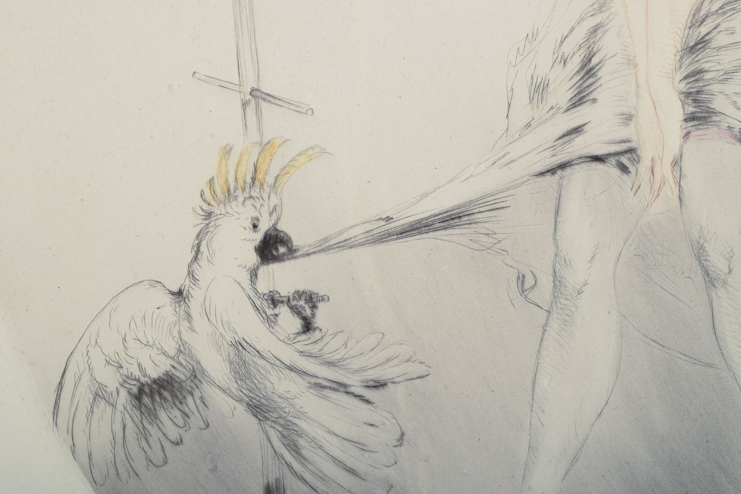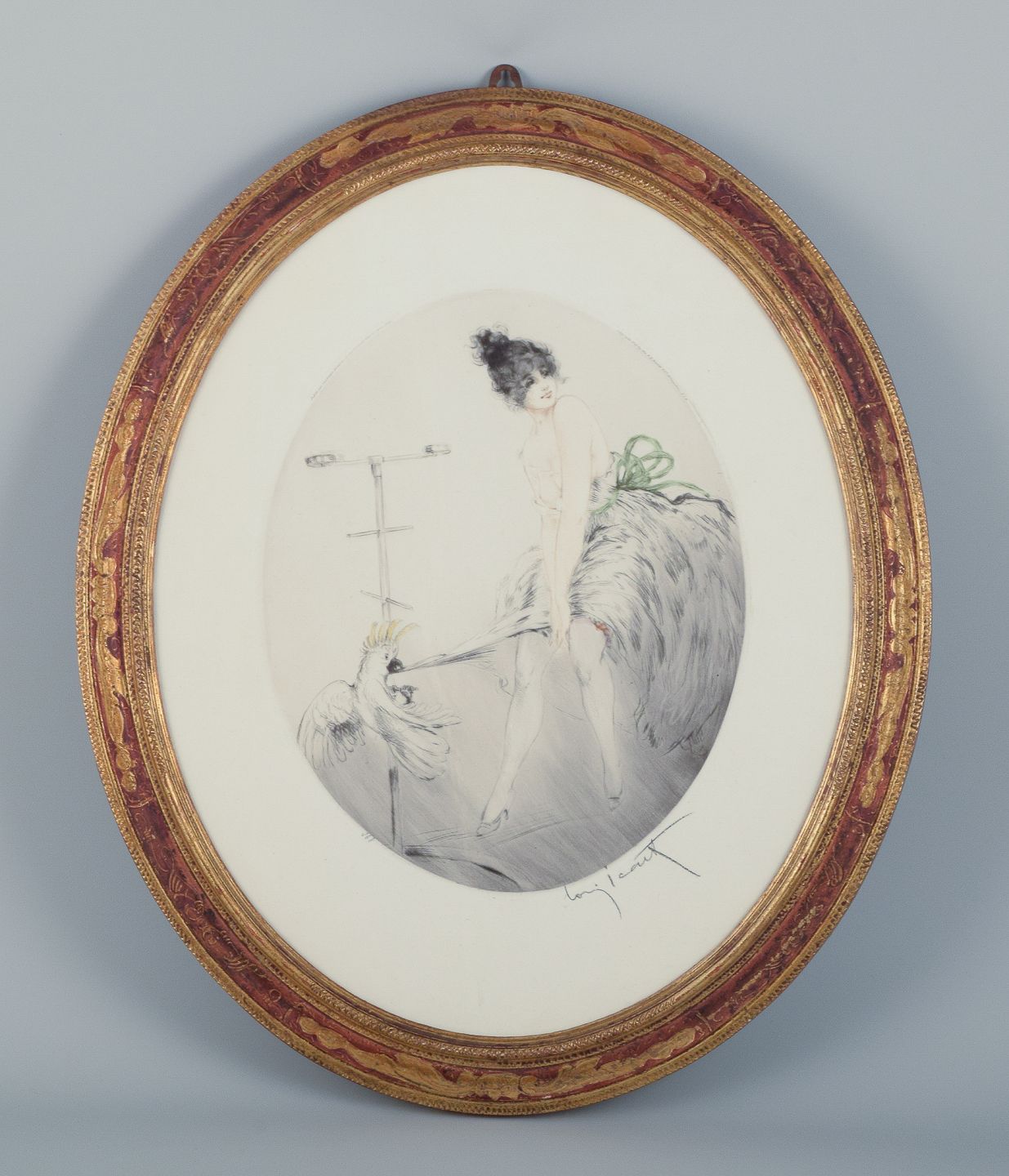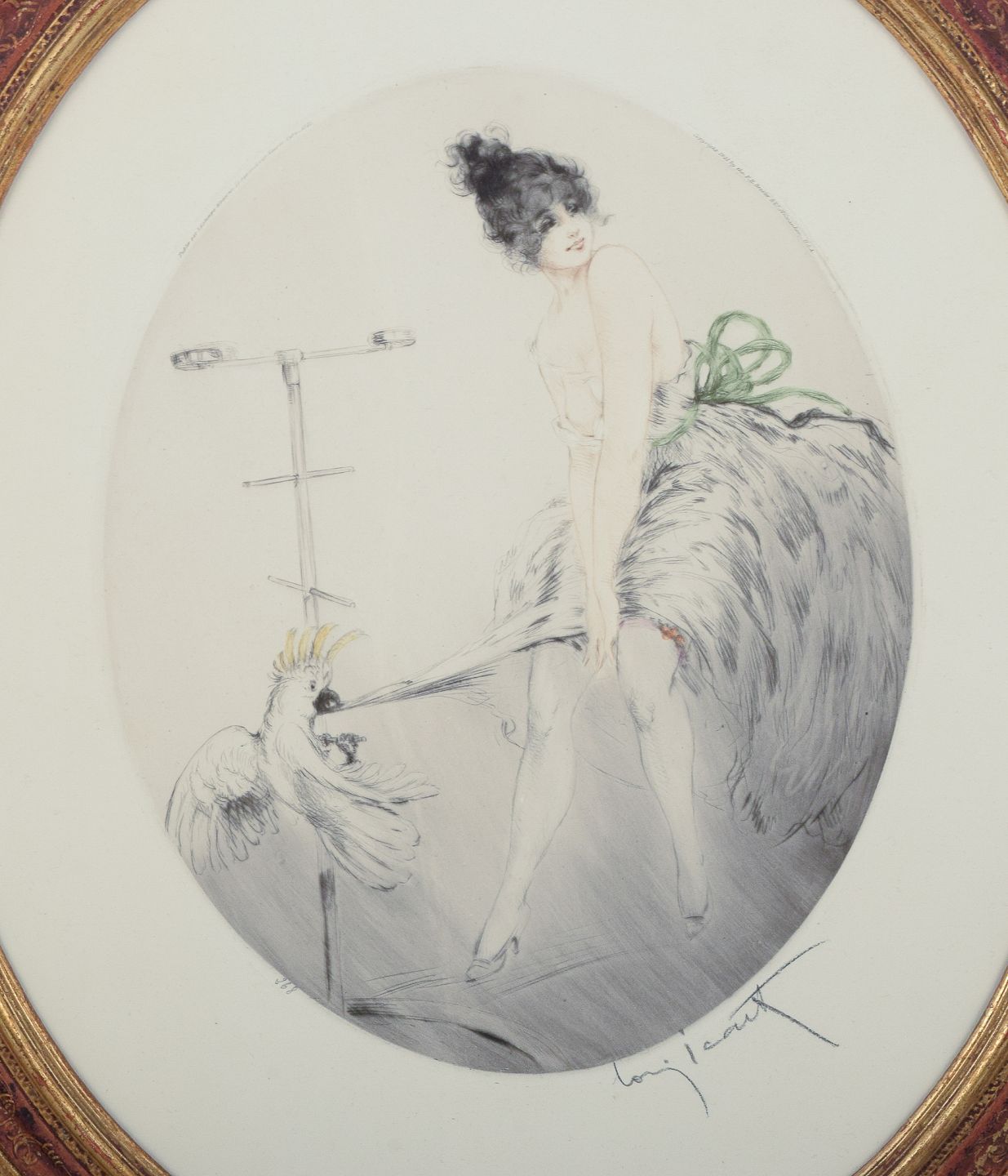 Louis Icart (1888-1950). Radering på papir. Letpåklædt kvinde og kakadue.