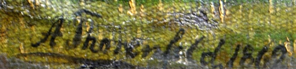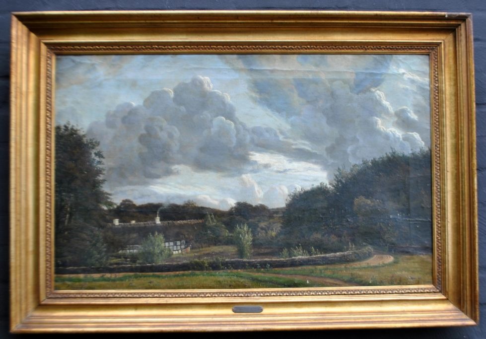 Thorenfeldt, Anton (1839 - 1907) Danmark: Landskab med bindingsværks gård. Olie på lærred. Signeret 1862. 47 x 76 cm. Indrammet: 63 x 89 cm.
