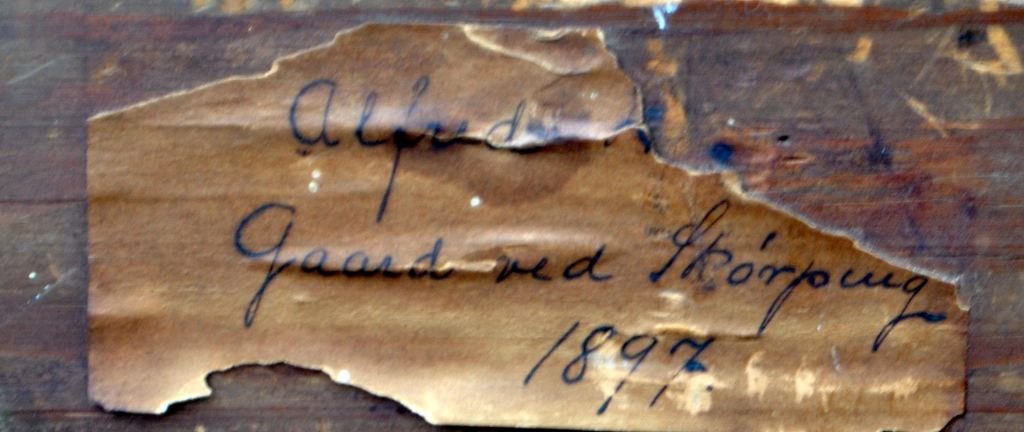 Larsen, Alfred Valdemar (1860-1946) Danmark. Gaard ved Skjørping. 1897. Olie på lærred. Verso label med kunstnerens navn og titel. H: 66 cm. B: 83 cm.