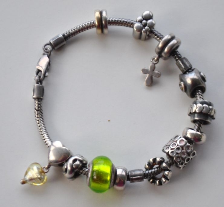 Aagaard sølv armbånd med 12 charms i sølv og glas. 20. årh. Danmark. Stemplet JAa, 925 og Lovelinks. L: 19,5 cm.