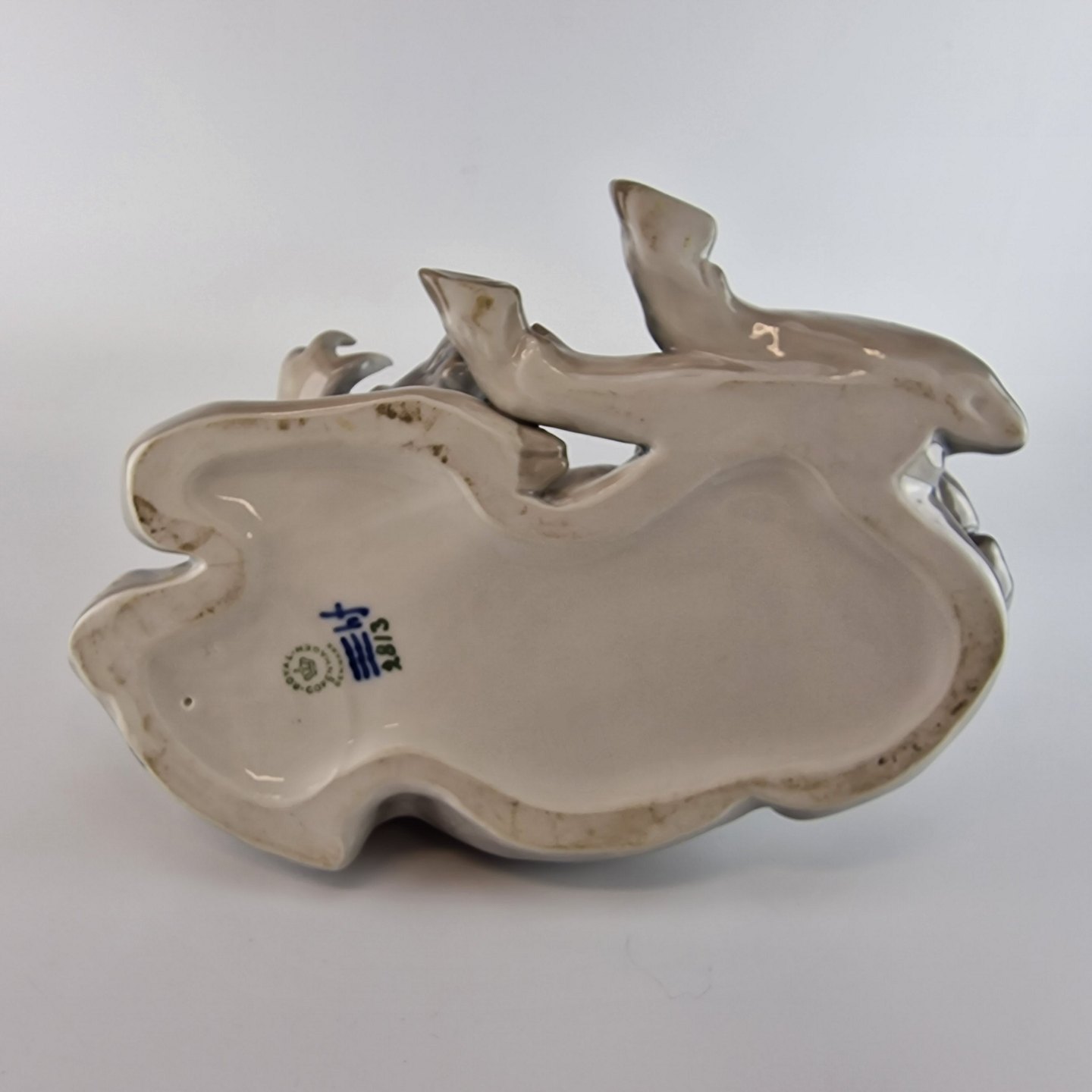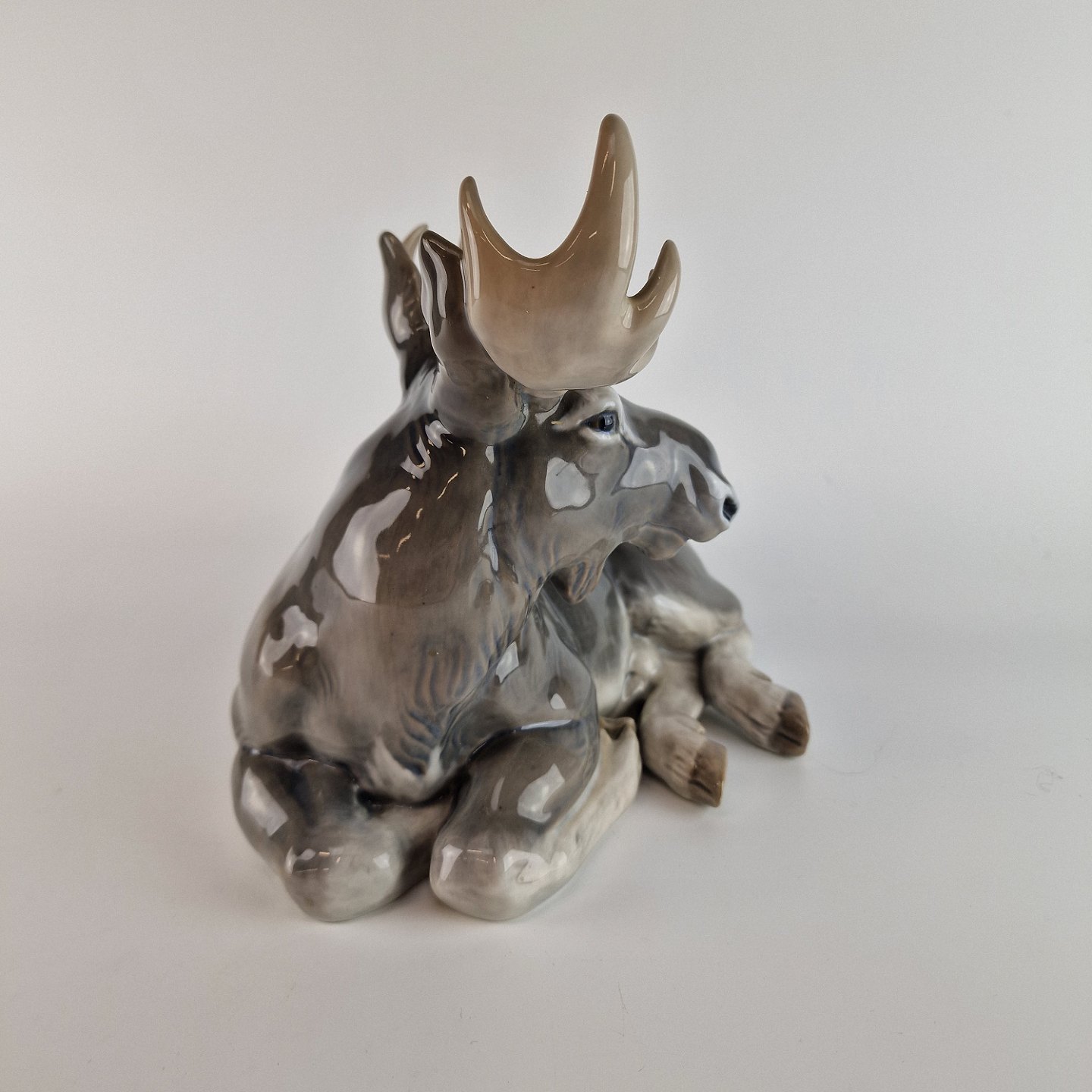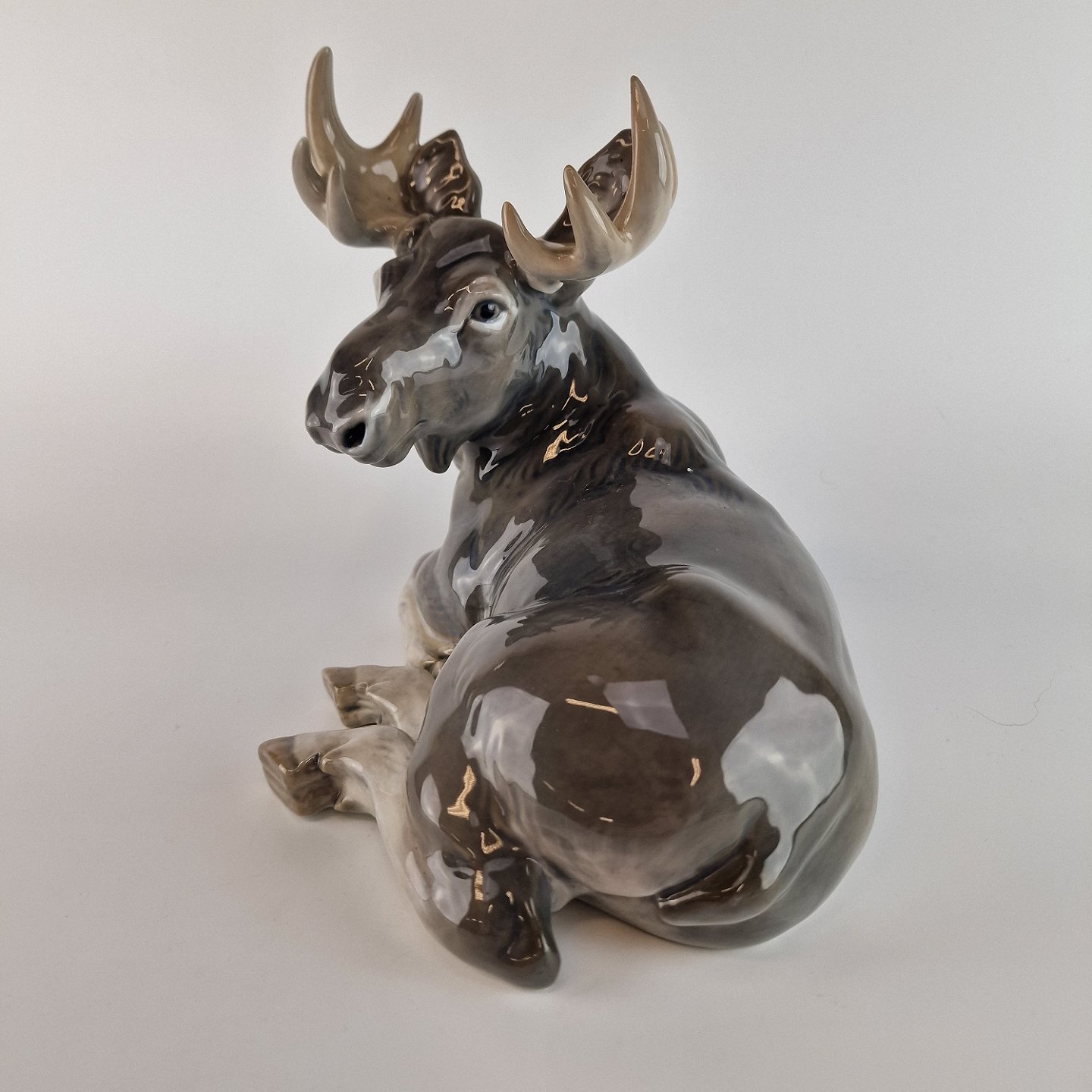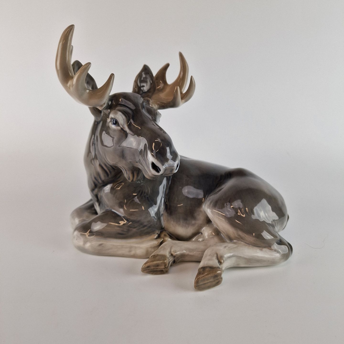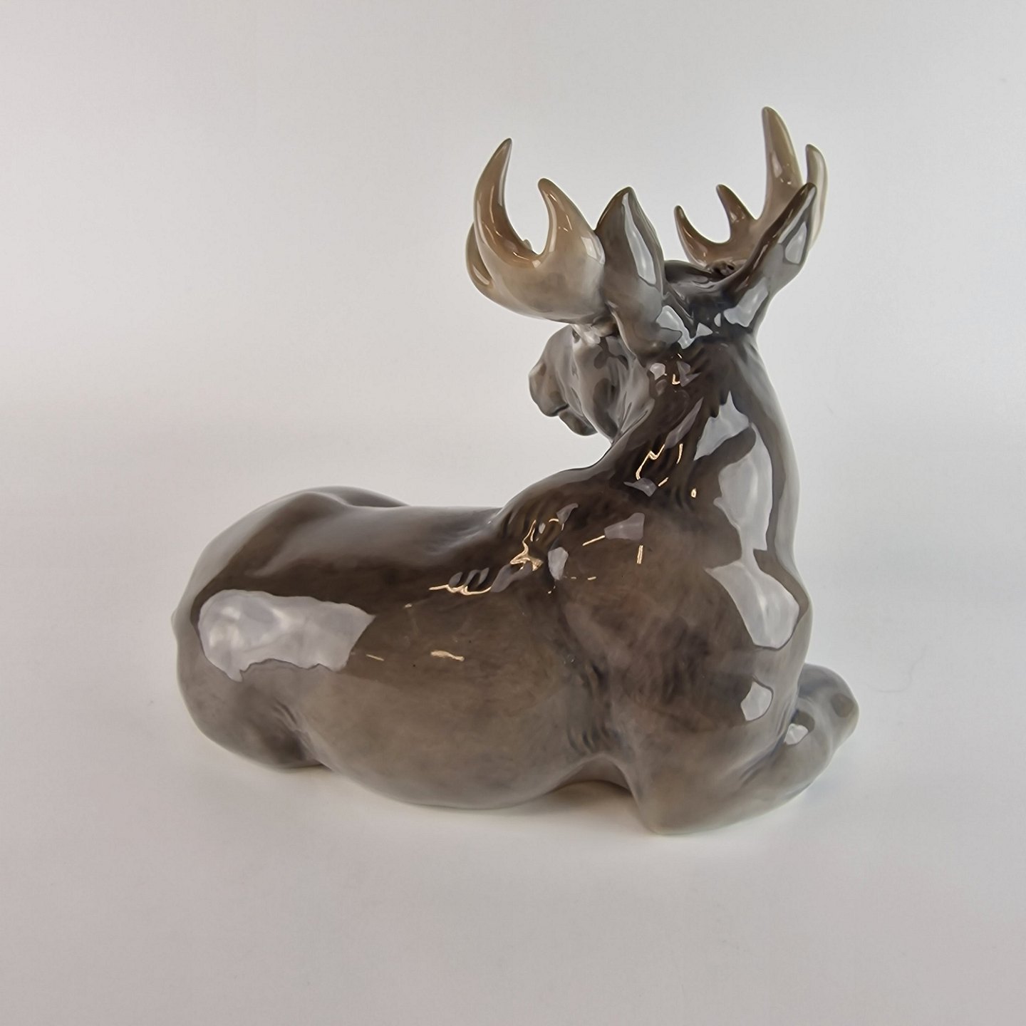 Figur af porcelæn i grå og brunlige farver. Formet som en Elg der ligger ned. No 2813